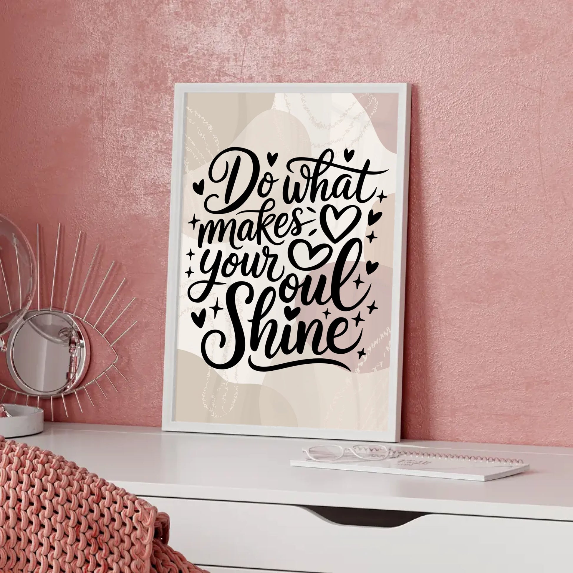 Entdecke unser einzigartiges Spruchposter Do what makes your soul shine, das nicht nur als dekoratives Element, sondern auch als tägliche Motivation in deinem Zuhause wirkt. Mit diesem Poster mit Spruch bringst du positive Energie und Inspiration in jede Ecke deines Lebens. Gestalte dein persönliches Poster selbst, indem du ein individuelles Hintergrundbild auswählst und so ein Kunstwerk schaffst, das ganz deinen Vorstellungen entspricht.