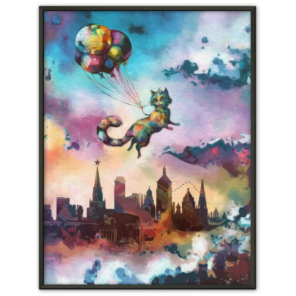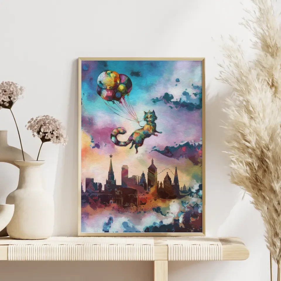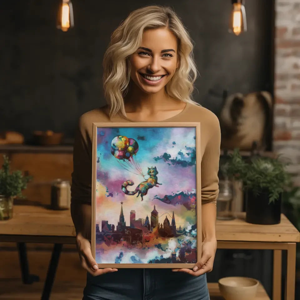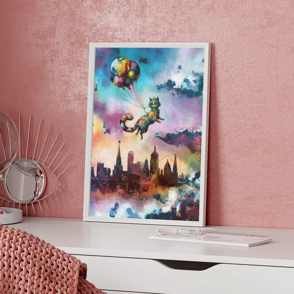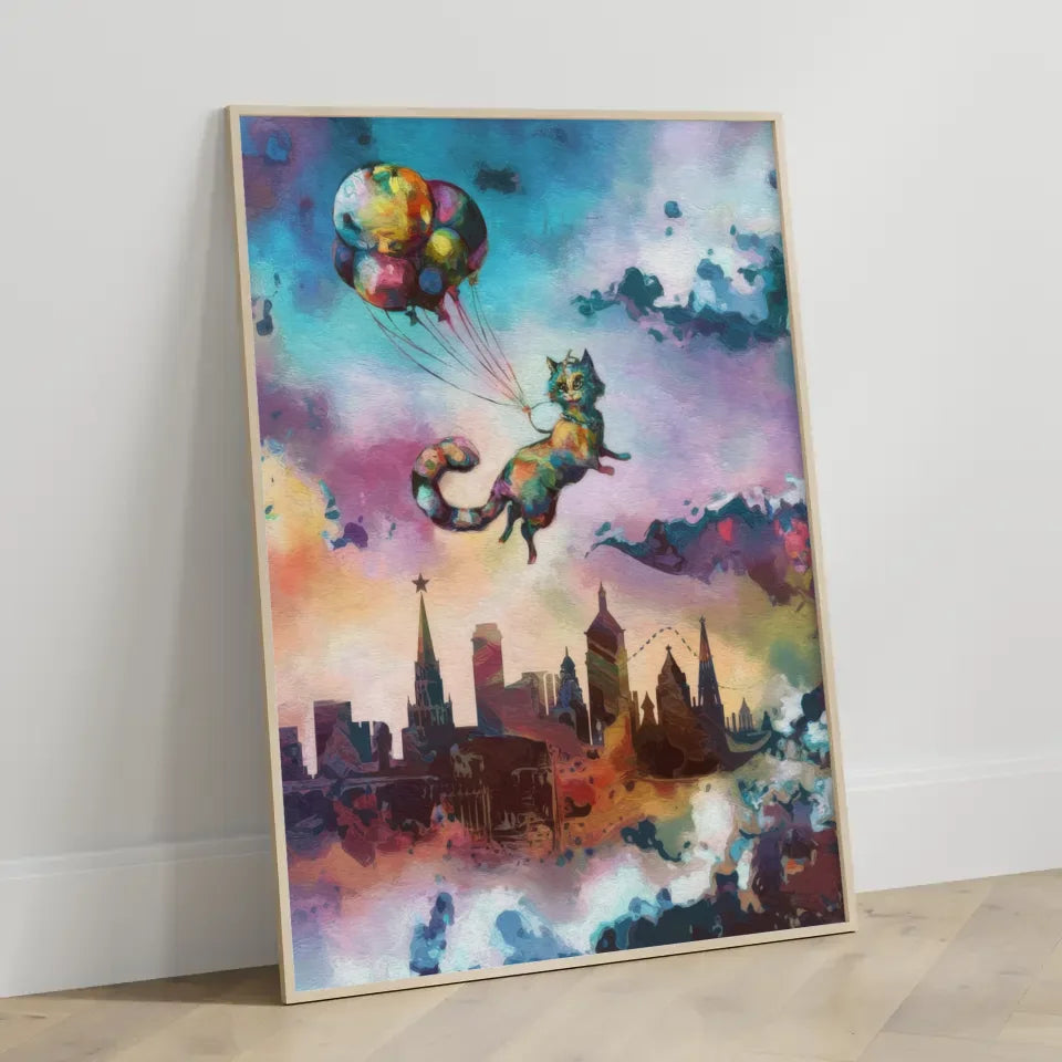 Dieses besondere Poster vereint die skurrile Note der katzenartigen Kreatur mit einem bunten Ballon und einer abstrakten Himmelslandschaft. Die leuchtenden Farben und traumhaften Formen ziehen den Betrachter in den Bann. Die sanften und luftigen Pinselstriche verleihen der fantastischen Szene eine gewisse Leichtigkeit und Lebensfreude. Erleben Sie, wie das zarte Gleichgewicht von Licht und Schatten in diesem Wandbild die Komplexität des Lebens symbolisiert.