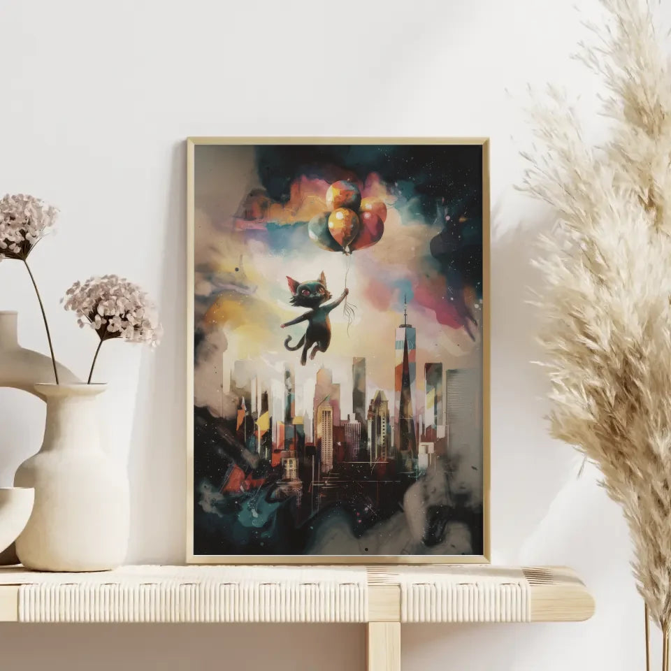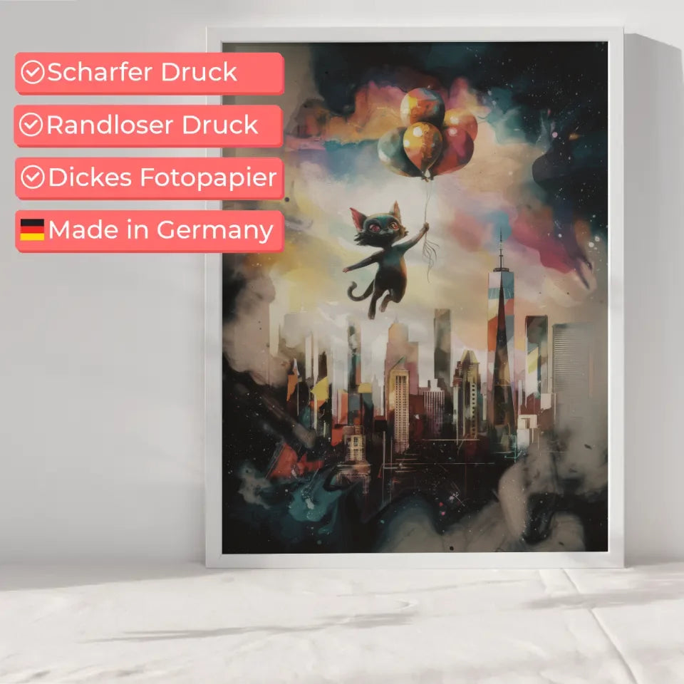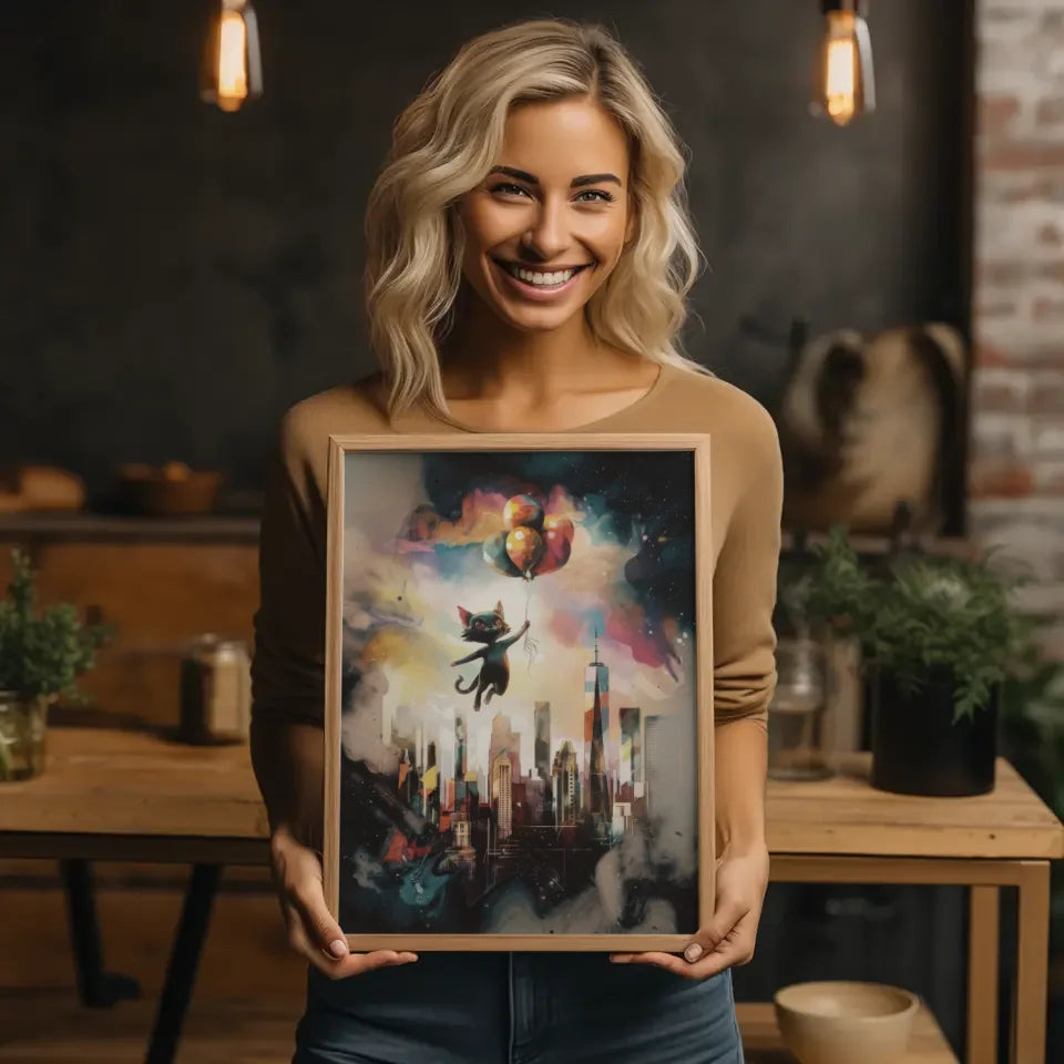 Entdecken Sie unser einzigartiges surrealistisches Poster mit Katze und New Yorker Skyline, das nicht nur als Wandkunst dient, sondern auch Geschichten erzählt. Dieses faszinierende Kunstwerk zeigt eine 3D-Stildarstellung eines Aquarellgemäldes, das mit einem dunklen Fantasy-Thema spielt. Die katzenartige Kreatur, die einen bunten Ballon in der Hand hält, schwebt anmutig über der ikonischen Skyline von New York City und schafft eine surrealistische Atmosphäre, die jeden Raum bereichert.