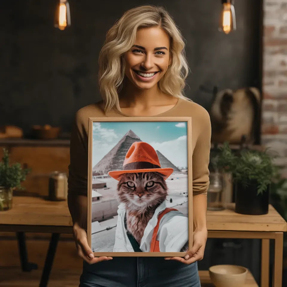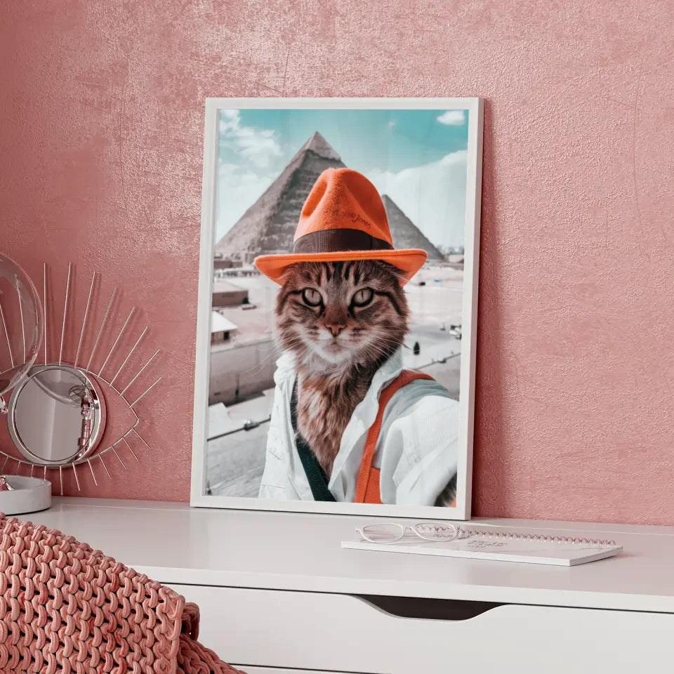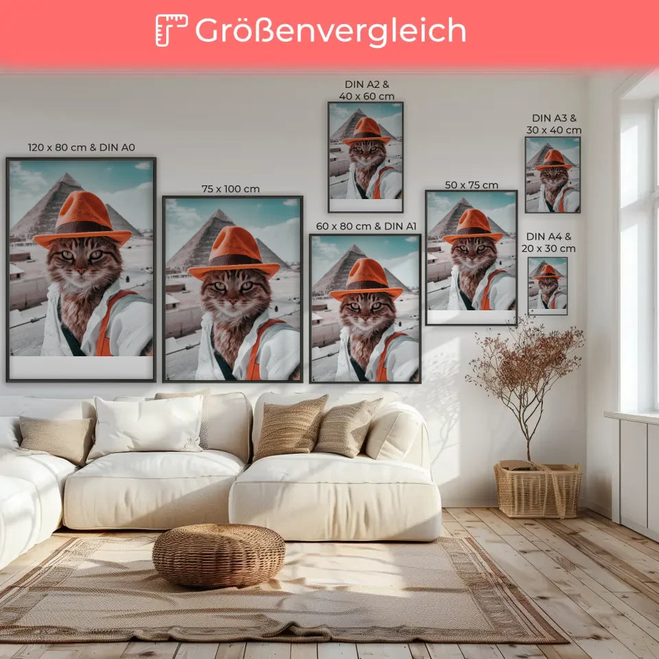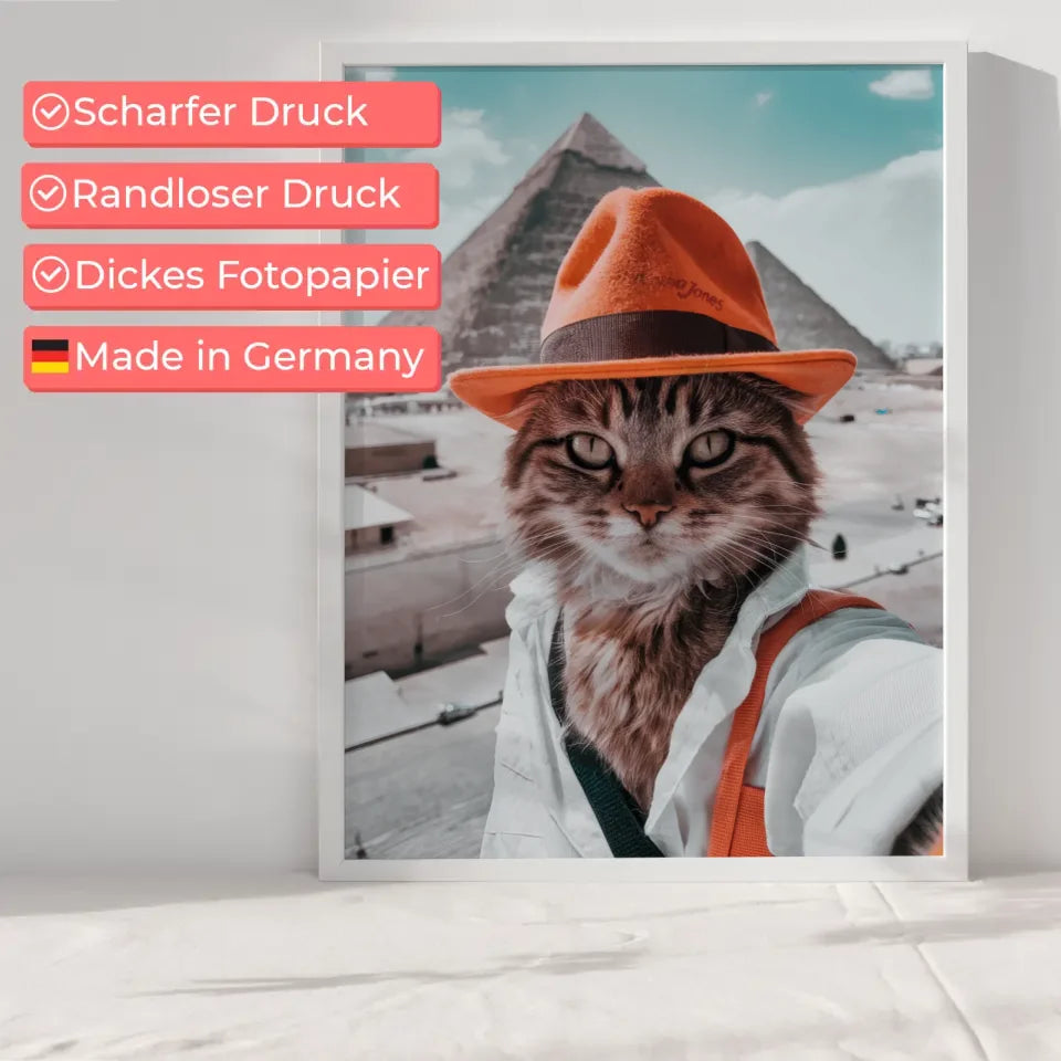 Entdecken Sie das bezaubernde Poster 'Süße Katze macht Selfie vor Cheops-Pyramide', ein absolutes Must-Have für Katzenliebhaber und Kunstliebhaber gleichermaßen. Dieses außergewöhnliche Poster zeigt eine süße Katze in einem orangefarbenen Hut und einem weißen Hemd, die sich vor der majestätischen Cheops-Pyramide in Ägypten ablichtet. Die lebendigen Farben und das strahlende Tageslicht verleihen diesem Bild eine fröhliche Note und werden garantiert zum Blickfang in jedem Raum.
