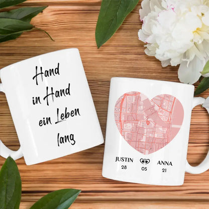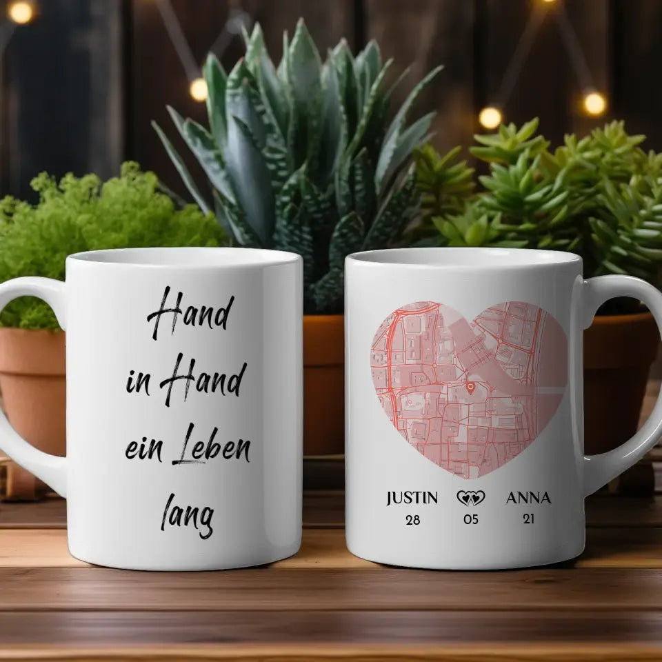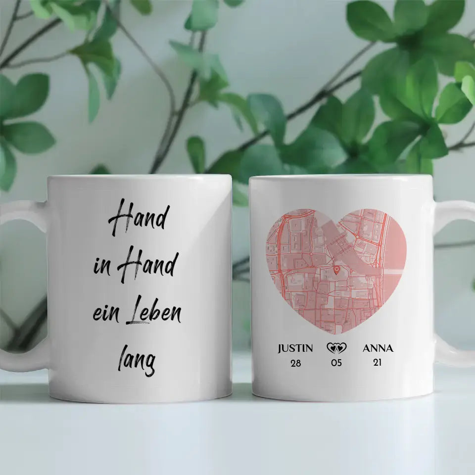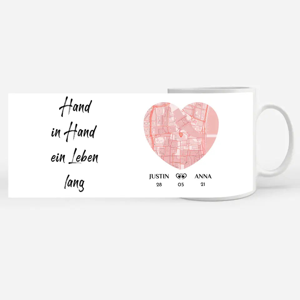 Unsere Tasse personalisiert für Paare Hand in Hand ein Leben lang Stadtkarte