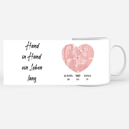 Tasse personalisiert für Paare Hand in Hand ein Leben lang Stadtkarte