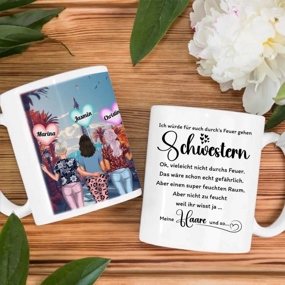 Du würdest gerne etwas einzigartiges schenken? Dann ist Unsere Tasse Schwesterherz Durchs Feuer gehen Schwestern Dubai Burj Khalifaein super schickes personalisiertes Geschenk.