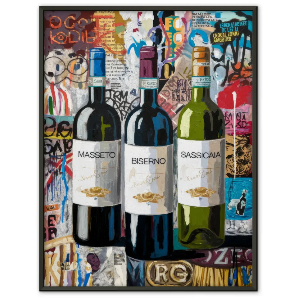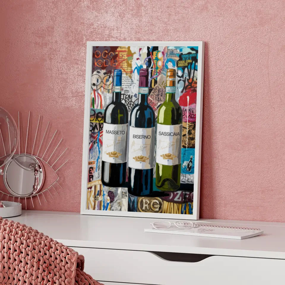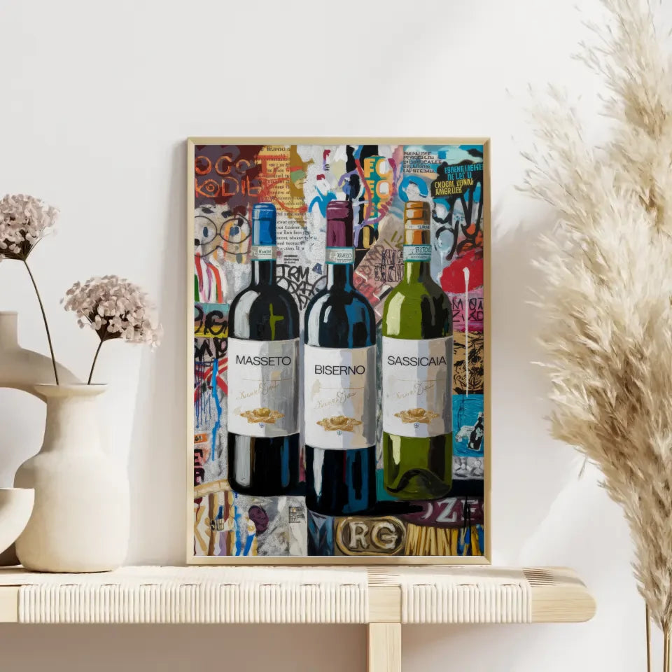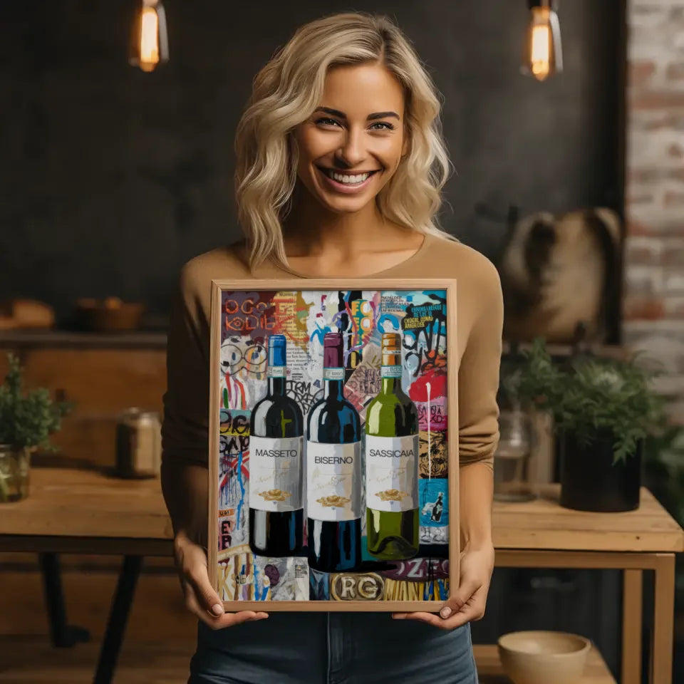 Entdecken Sie unser einzigartiges urbanes Poster mit Weinflaschen und Graffiti Design, das Ihrer Küche einen künstlerischen Akzent verleiht. Dieses eindrucksvolle Poster zeigt drei stilvolle Weinflaschen, die jeweils mit den Namen Masseto“, Biserno“ und Sassicaia“ beschriftet sind. Vor einem lebendigen Hintergrund aus Graffiti und Collagen bietet das Poster nicht nur einen Blickfang, sondern erzählt auch eine Geschichte von Genuss und Urbanität. Das Graffiti umfasst interessante Texte, Symbole und abstrakte Designs, die das Gesamtbild lebendig und vielseitig machen. Ideal für alle Weinliebhaber und Kunstenthusiasten, bringt dieses Poster eine harmonische Verbindung zwischen der Welt des guten Weins und der Street Art in Ihre Küche. Lassen Sie sich von der einzigartigen Atmosphäre dieses Wandbildes inspirieren und verwandeln Sie Ihren Raum in eine stimmungsvolle Oase des Genusses. Holen Sie sich jetzt das urbane Poster und verleihen Sie Ihrer Einrichtung einen Hauch von Flair und Originalität.
