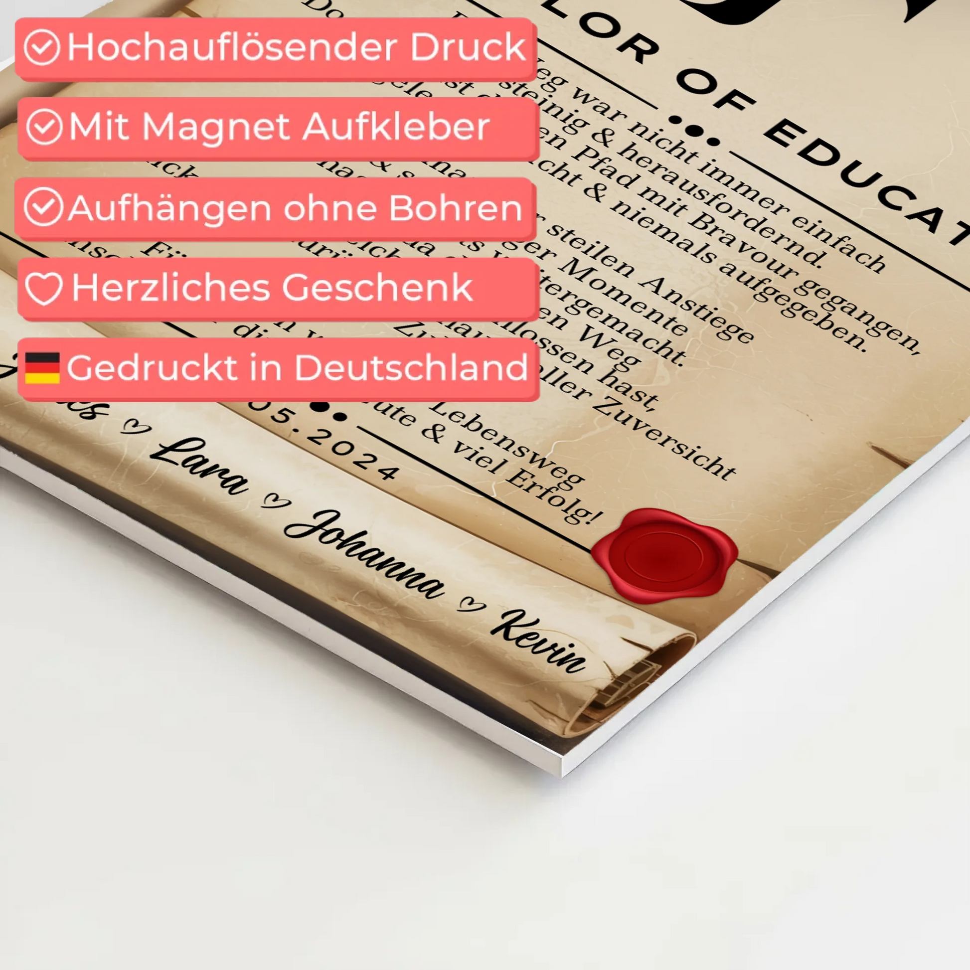 Feiere deinen Erfolg mit unserem einzigartigen Urkunde Fotoboard Magnet Wandbild, das perfekt als Geschenk Zum Bestandenen Bachelor geeignet ist. Dieses personalisierte Bachelor Of Education-Wandbild ist eine tolle Erinnerung an deinen hart erarbeiteten Bachelorabschluss. Das Geschenk Zum Bachelorabschluss lässt sich individuell gestalten, indem du den Initial Buchstabe, das Datum sowie einen Wunschtext nach deinen Vorstellungen anpasst. Damit wird dein Geschenk Bachelorabschluss zu einem ganz besonderen Highlight und zeigt deine persönliche Note. Ob für dich selbst oder als Anerkennung für einen Freund oder eine Freundin – dieses Urkunde Fotoboard Magnet Wandbild ist das perfekte Geschenk Zum Bachelor. Es eignet sich ideal als Geschenk Zum Bestandenen Bachelor, um den Erfolg stilvoll zu feiern und unvergesslich zu machen. Überrasche deine Liebsten mit einem individuellen, hochwertigen Geschenk, das den Abschluss gebührend würdigt und noch lange in Erinnerung bleibt.