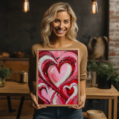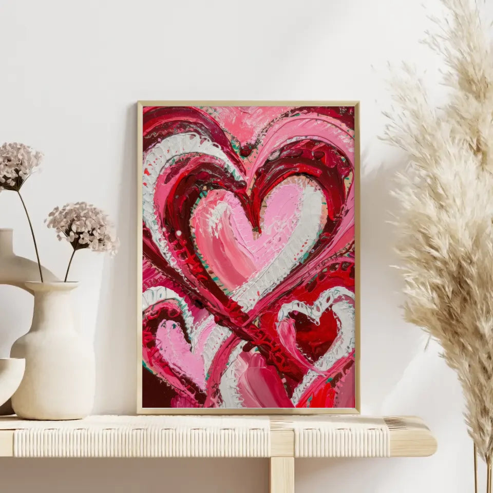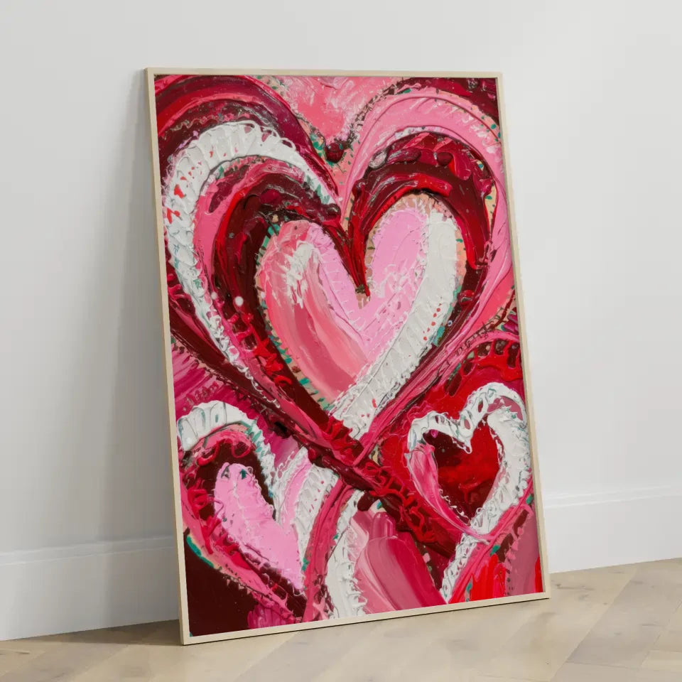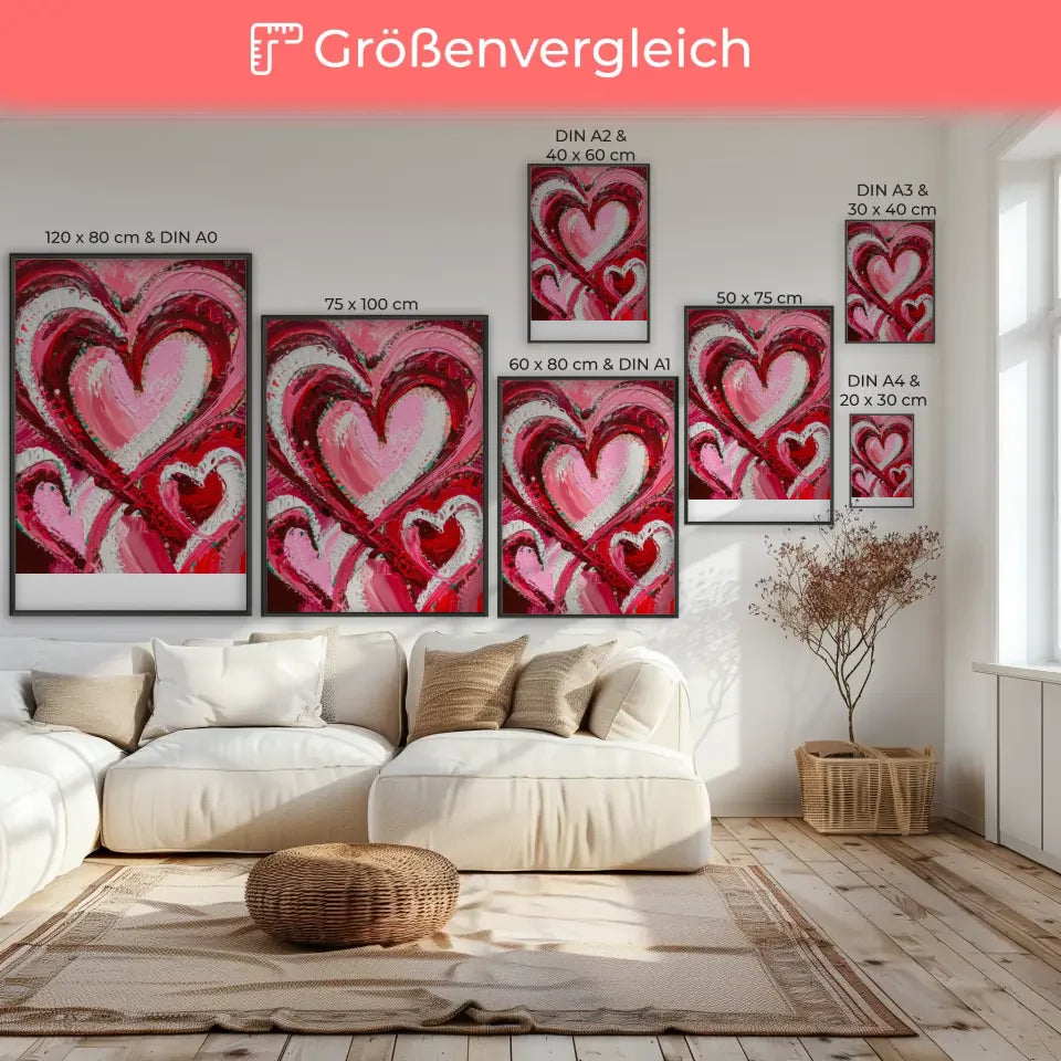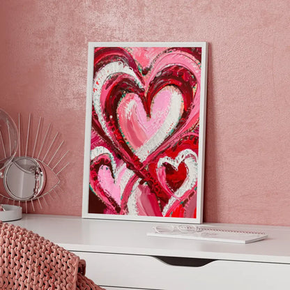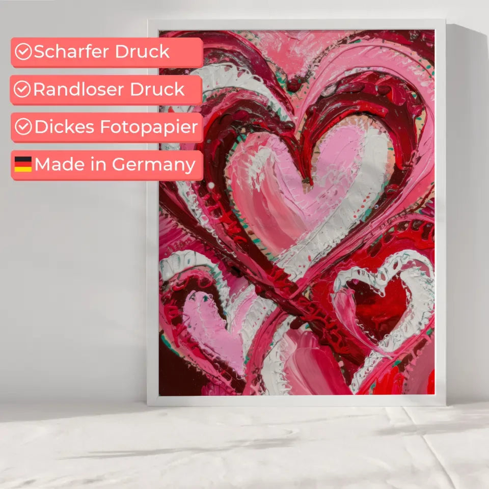 Entdecken Sie unser einzigartiges Valentinstag Poster im Country-Art-Stil, das Ihre WĂ€nde in ein harmonisches Liebesnest verwandelt. Dieses beeindruckende Wandbild spiegelt die Emotionen und die Leidenschaft des Valentinstags wider. Mit lebendigen Rot-, Rosa- und WeiĂtönen gestaltet, zeigt das Poster ineinander verschlungene Herzen, die förmlich zum Leben erwachen. Die Textur und die dynamische Farbbewegung verleihen dem Bild eine lebendige Tiefe, die jeden Betrachter in ihren Bann zieht.