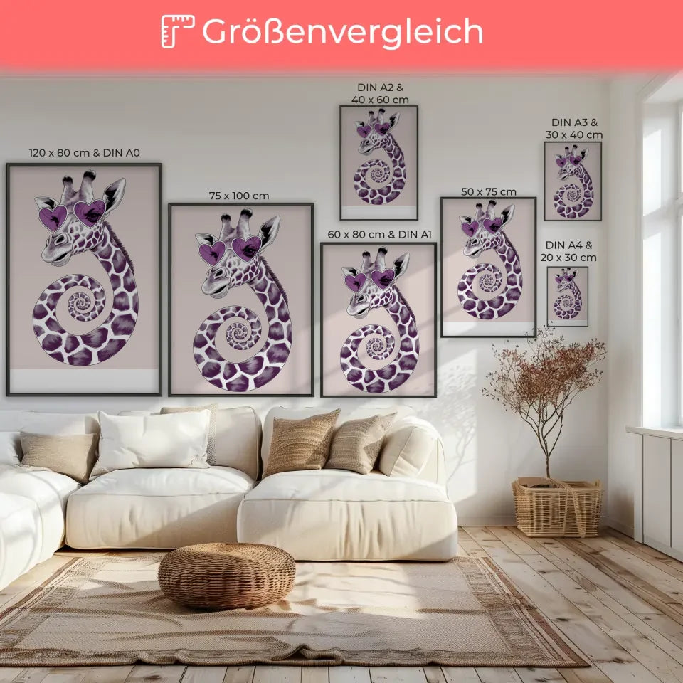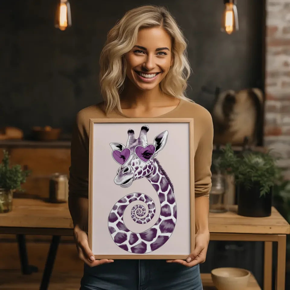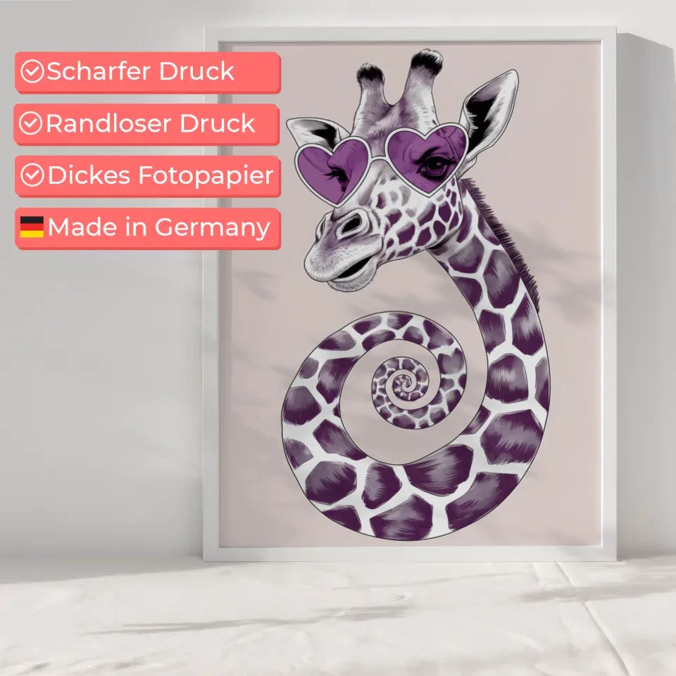 Bringen Sie Farbe und Lebensfreude in Ihr Zuhause mit unserem einzigartigen Poster: dem verspielten Giraffen Poster mit herzförmiger Sonnenbrille und lila GlĂ€sern. Dieses Kunstwerk zeigt eine charmante Giraffe mit einem spiralförmigen Hals, die durch ihre modische Sonnenbrille ins Auge fĂ€llt. Der sanfte beige Hintergrund sorgt dafĂŒr, dass das Hauptmotiv, das Gesicht der Giraffe, im Fokus steht und sofort die Aufmerksamkeit Ihrer GĂ€ste auf sich zieht.
