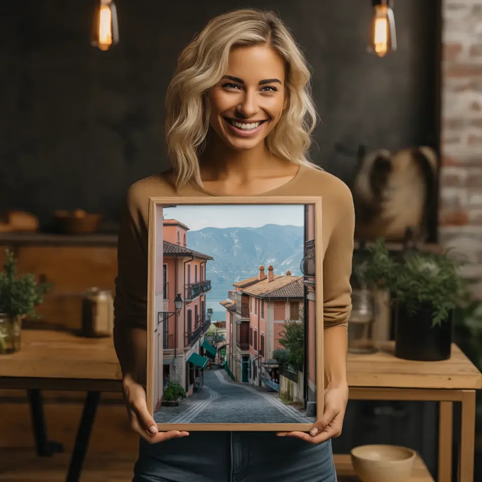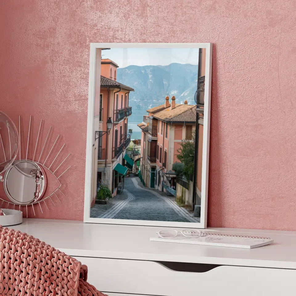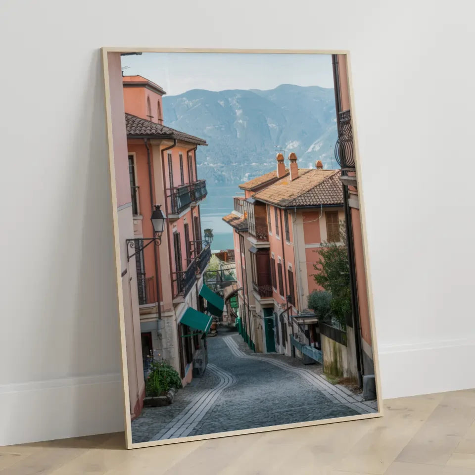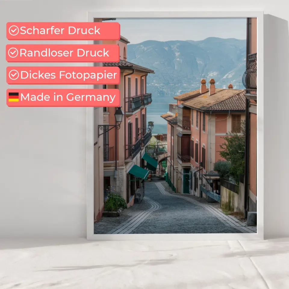 Im Hintergrund erhebt sich ein ruhiger See, umgeben von üppig grünen Bergen, der die harmonische Atmosphäre dieses Posters perfekt ergänzt. Ob für Ihre eigenen vier Wände oder als Geschenk für Freunde und Familie – dieses Poster ist eine hervorragende Wahl für Liebhaber von Städten & Ländern.