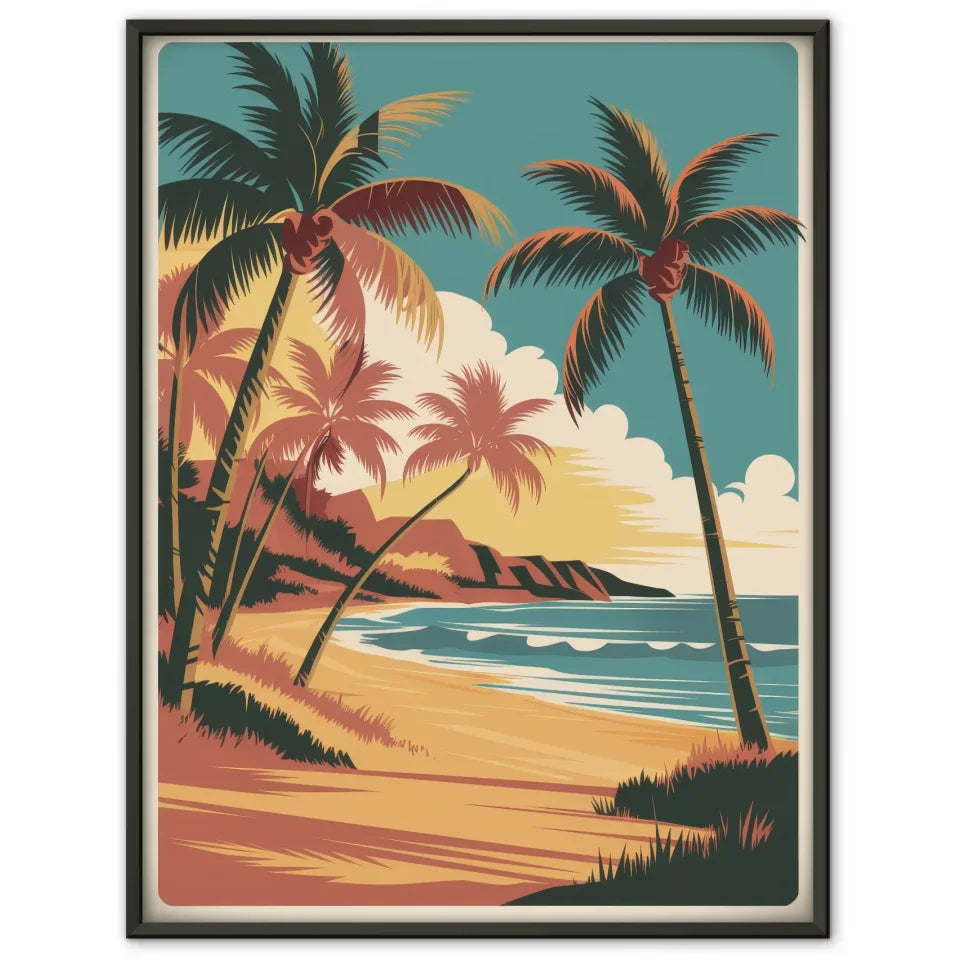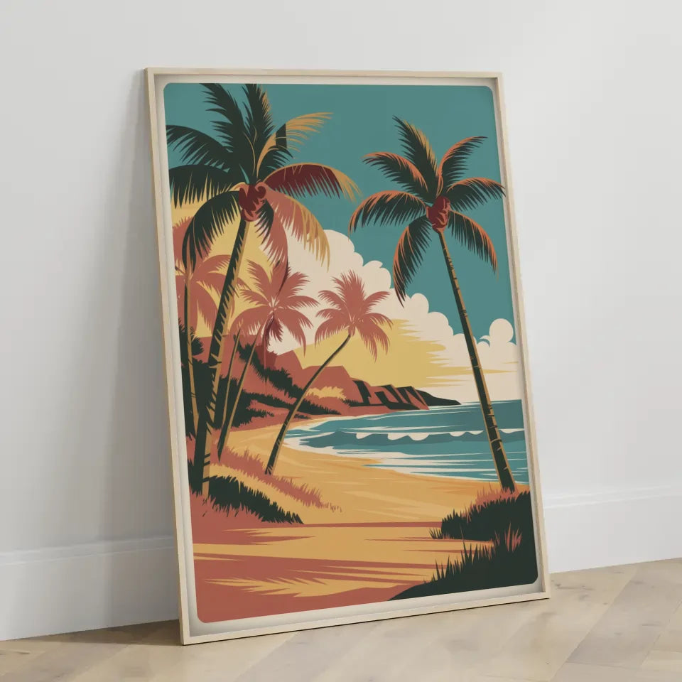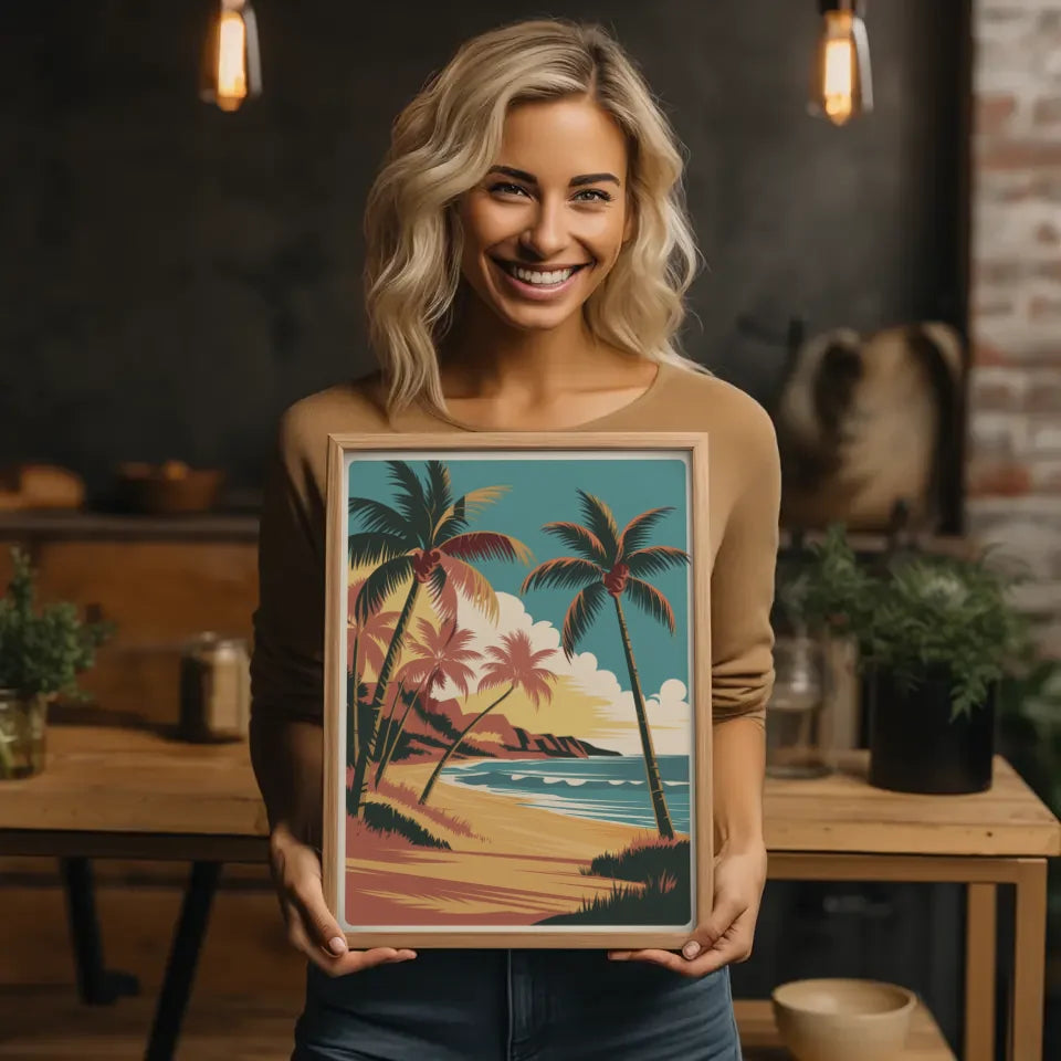 Die kräftigen Linien und die hohe Auflösung der Illustration unterstreichen die Details und sorgen dafür, dass das Vintage Hawaii Poster lebendig und ansprechend wirkt. Genießen Sie die leuchtenden Farben und die einfache Komposition, die Ihre Wände zum Strahlen bringen werden. Mit der natürlichen Beleuchtung und den sanften Schatten schafft dieses Poster eine harmonische und einladende Atmosphäre in jedem Raum.