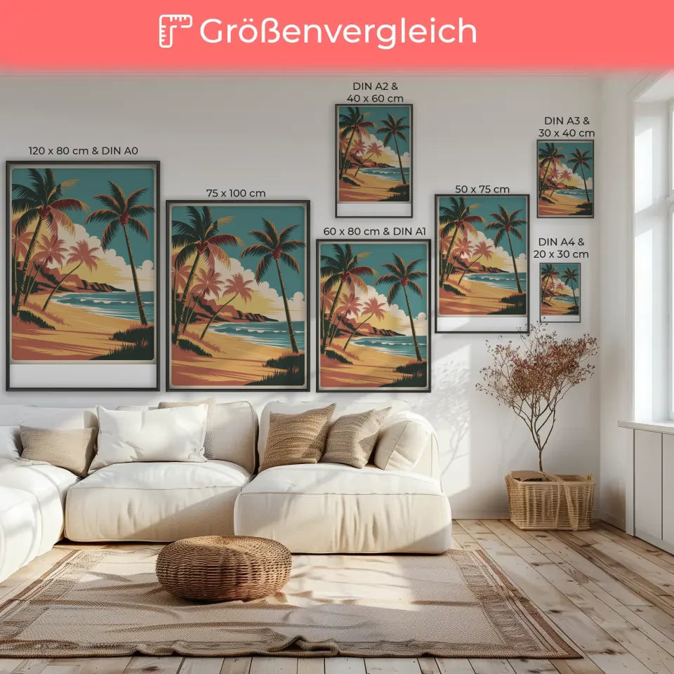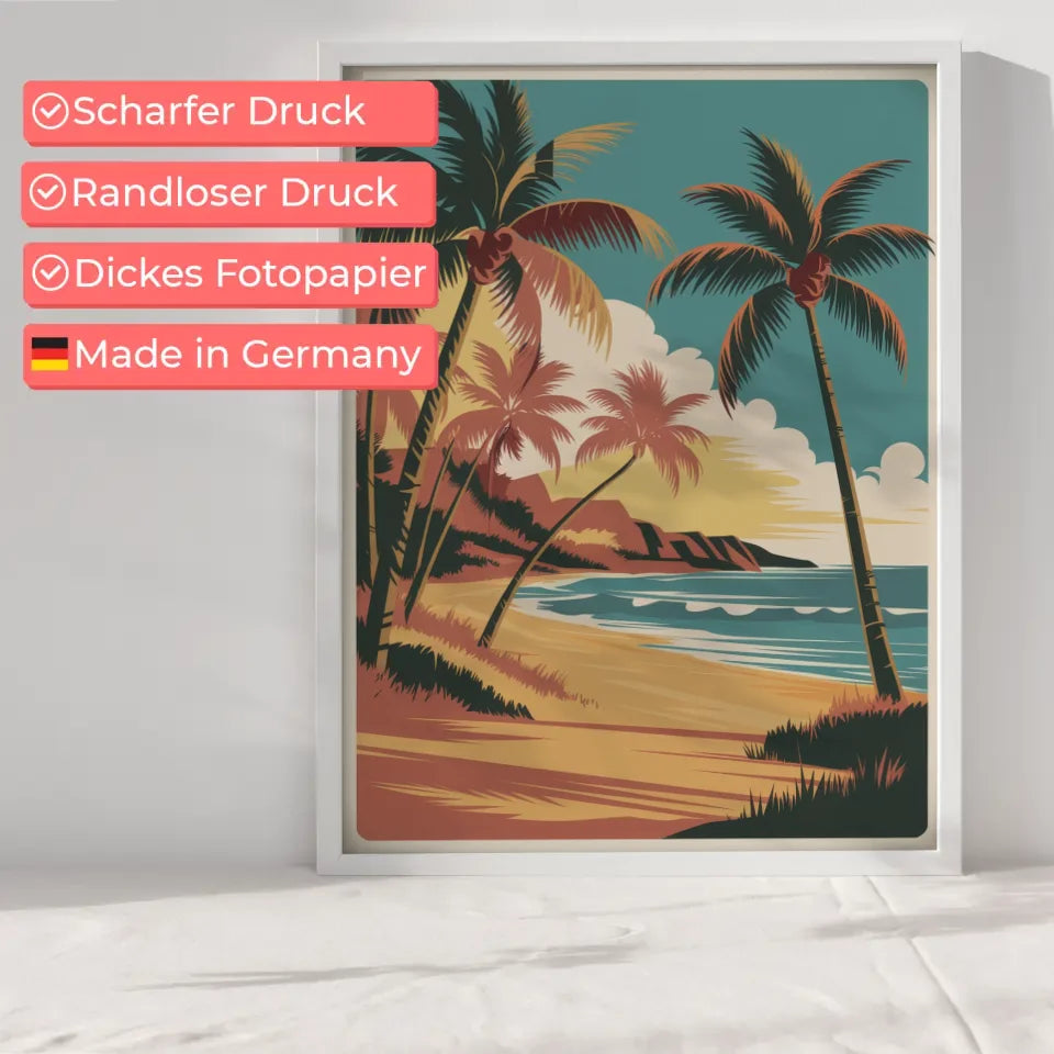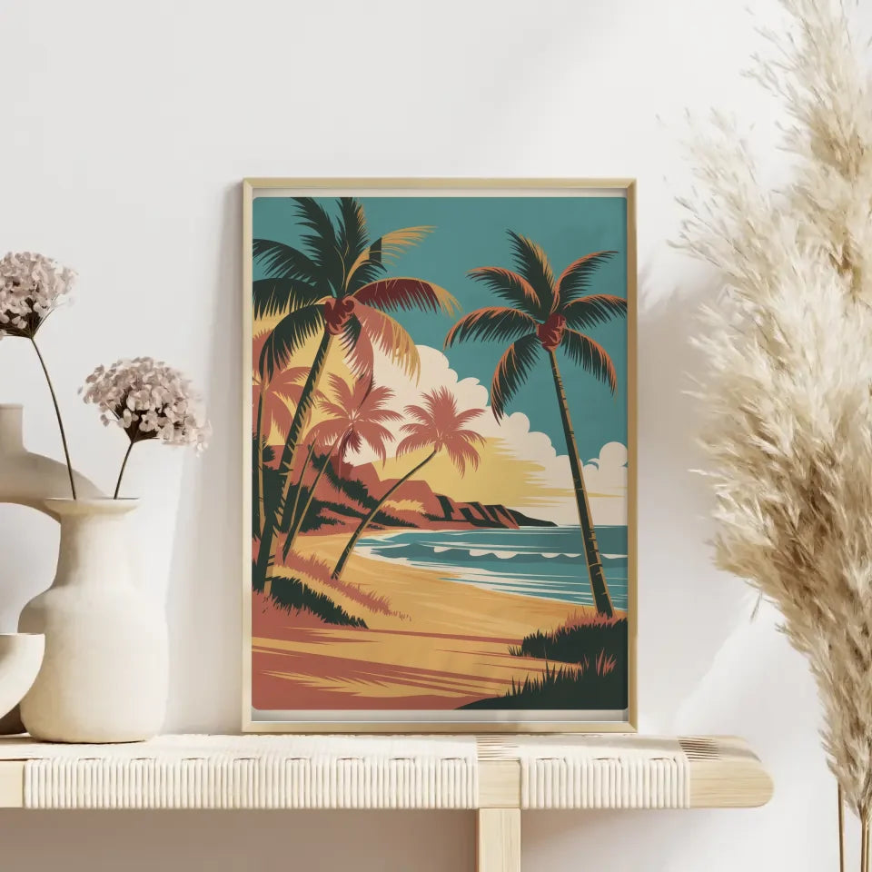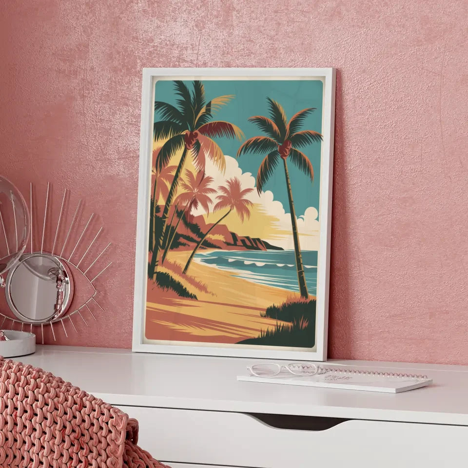 Die kräftigen Linien und die hohe Auflösung der Illustration unterstreichen die Details und sorgen dafür, dass das Vintage Hawaii Poster lebendig und ansprechend wirkt. Genießen Sie die leuchtenden Farben und die einfache Komposition, die Ihre Wände zum Strahlen bringen werden. Mit der natürlichen Beleuchtung und den sanften Schatten schafft dieses Poster eine harmonische und einladende Atmosphäre in jedem Raum.