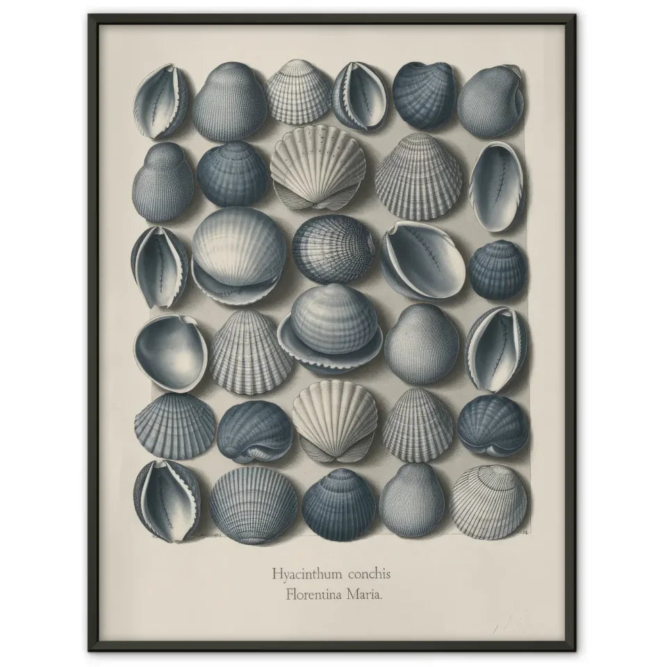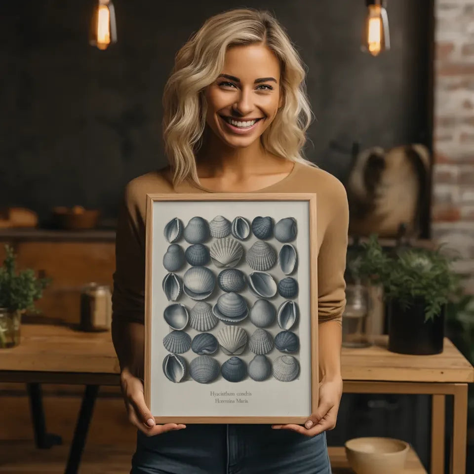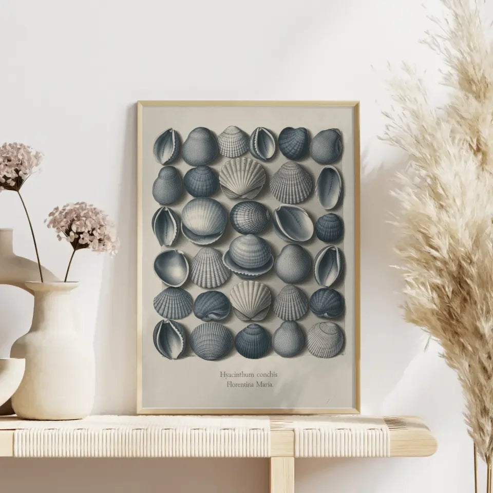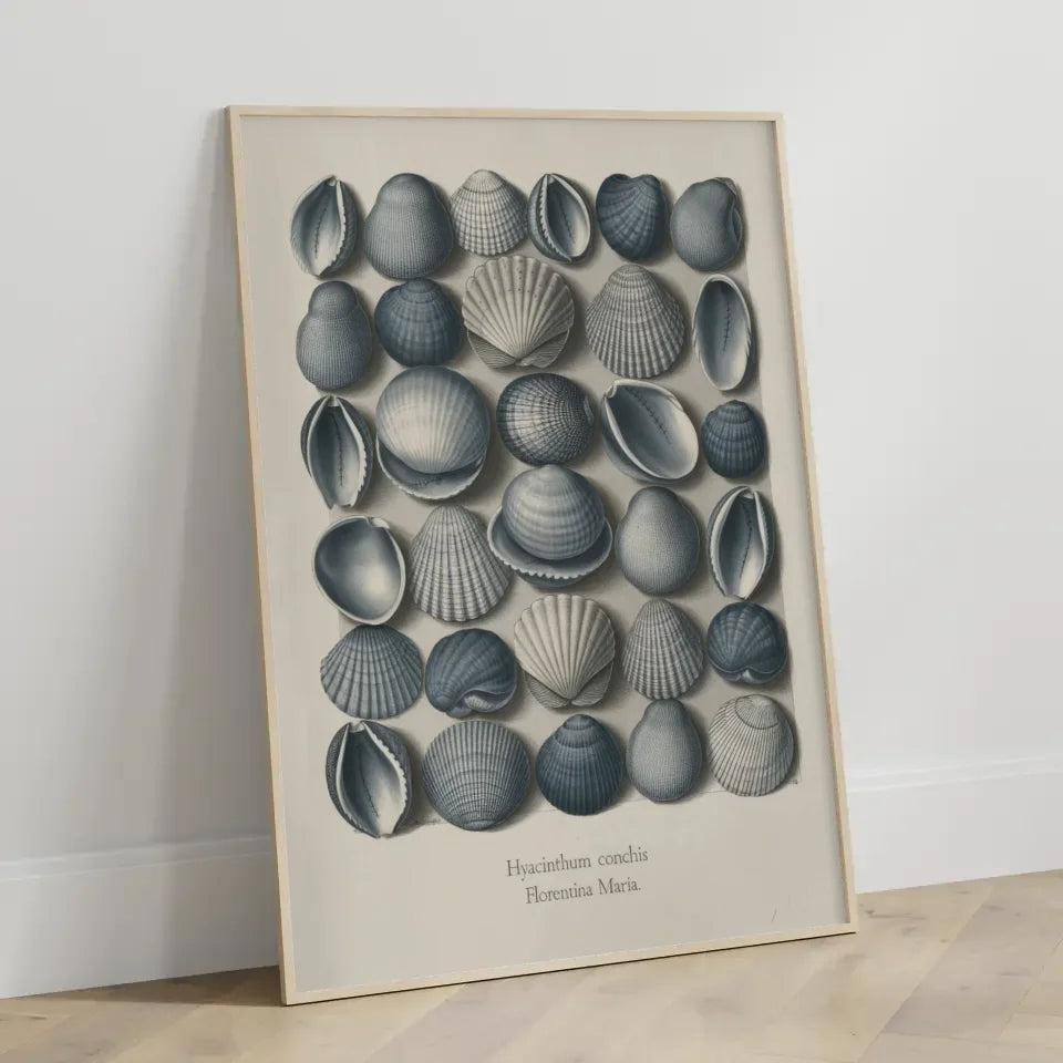 Am unteren Rand des Posters finden Sie den Titel 'HYACINTHUM CONCHIS“, gefolgt vom Namen 'Florentina Maria“, was den kunstvollen Charakter des Bildes unterstreicht. Die spontane Anordnung der Muscheln ohne klare Muster betont ihre natürliche Schönheit und Vielfalt. Dieses Poster ist nicht nur ein Blickfang, sondern bringt auch eine ruhige und entspannende Atmosphäre in jeden Raum. Ideal für Badezimmer, Schlafzimmer oder gemütliche Leseecken, verwandelt dieses Kunstwerk Ihre Wände in maritime Oasen der Ruhe.