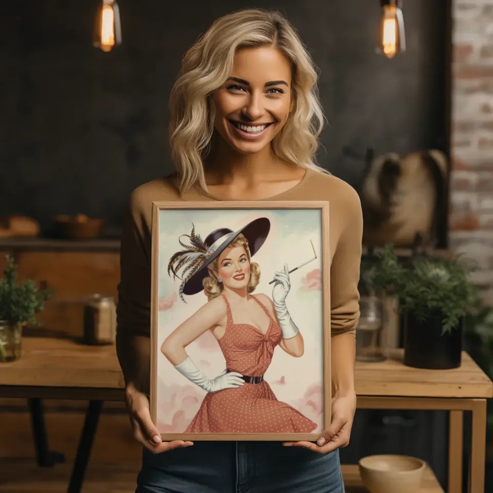 Entdecken Sie das einzigartige Vintage Pin-up Poster mit rotem Kleid und pastellfarbenem Hintergrund, das jedem Raum eine nostalgische Note verleiht. Dieses atemberaubende Poster zeigt ein charmantes Porträt einer selbstbewussten Frau in einem gepunkteten Kleid, ergänzt durch elegante weiße Handschuhe und einen auffälligen, mit Federn geschmückten Schlapphut. Die kunstvollen Details und die Spielereien in ihrer Pose verleihen diesem Kunstwerk eine lebendige Ausstrahlung und machen es zu einem echten Highlight unter den Wandbildern.