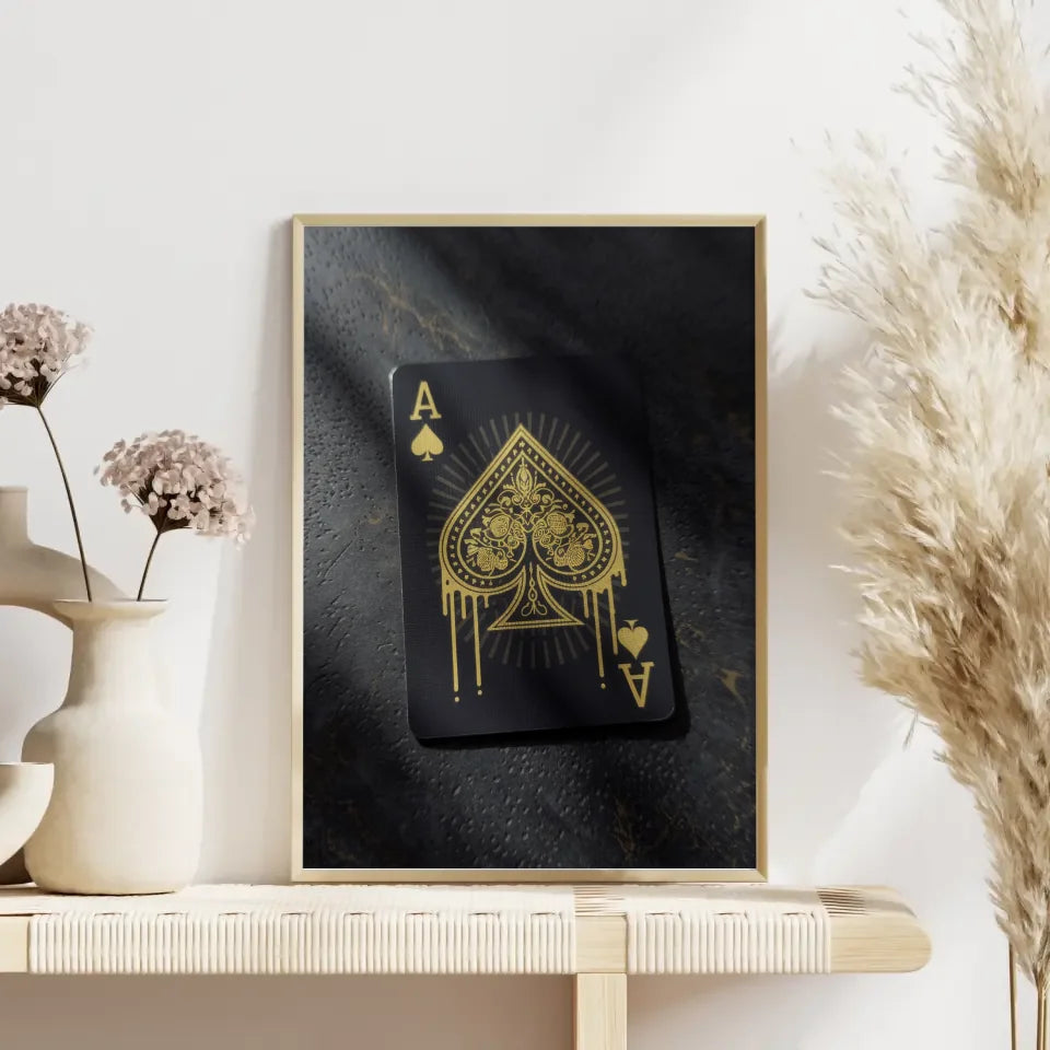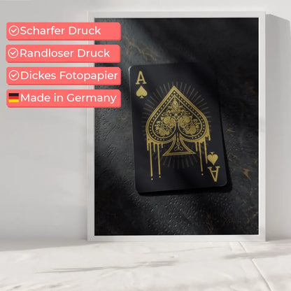 Entdecken Sie unser einzigartiges Vintage Poster Ace of Spades mit goldenen Mustern, das Ihrer Einrichtung einen Hauch von Eleganz verleiht. Dieses beeindruckende Poster zeigt eine detailreiche Illustration einer Ace of Spades“-Spielkarte, die auf einem dunklen, strukturierten Hintergrund zur Geltung kommt. Die kunstvollen goldenen Muster und Motive machen dieses Poster zu einem echten Blickfang und verleihen jedem Raum eine stilvolle Note.