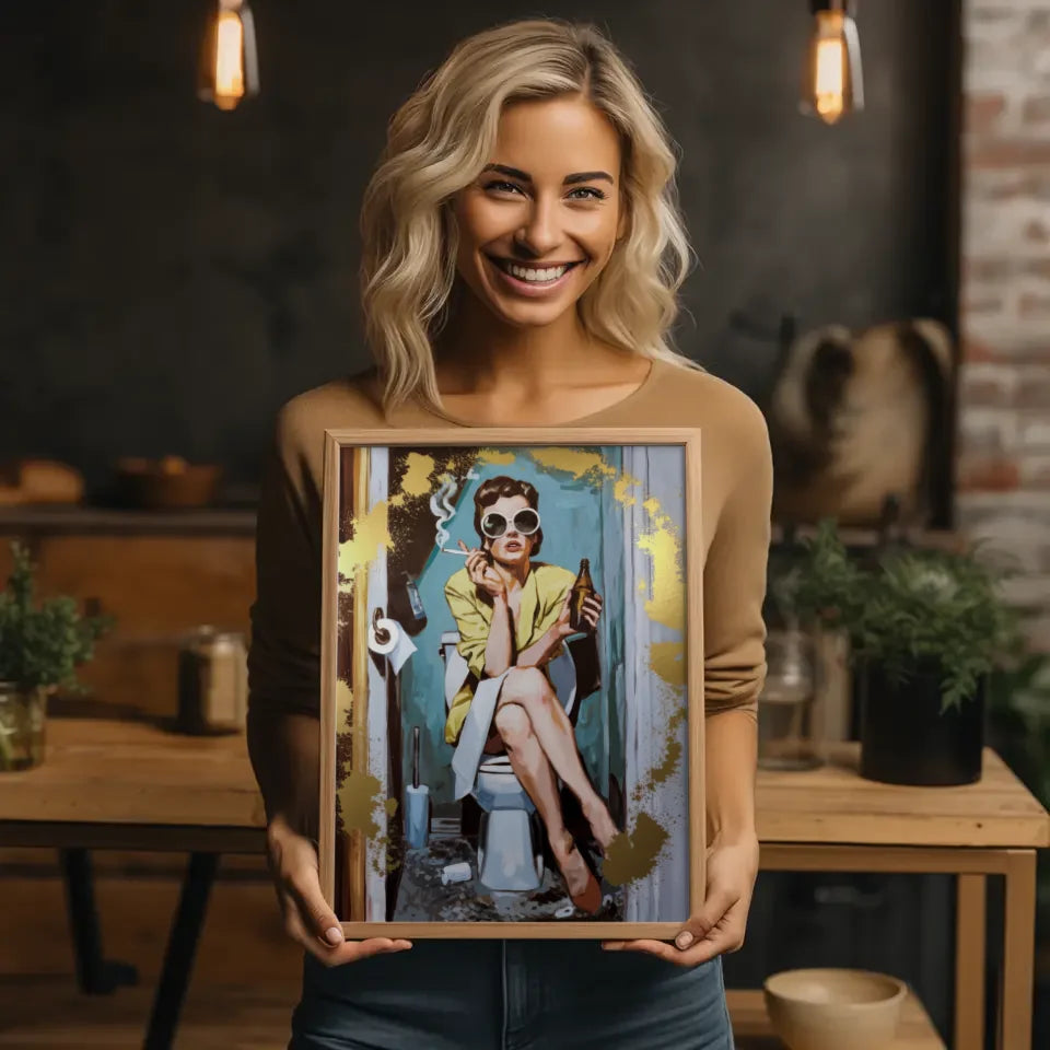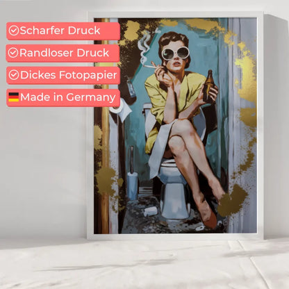 Entdecken Sie unser einzigartiges Vintage Poster einer Frau im Badezimmer mit Sonnenbrille und Zigarette, das jedem Raum einen besonderen Charme verleiht. Dieses Poster zeigt eine stilvolle Frau, die auf einer Toilette sitzt und in entspannter Pose ihr Leben genießt. Mit ihrer großen weißen Sonnenbrille und einer Zigarette in der Hand, verkörpert sie eine unbeschwerte Eleganz. Das Bild ist nicht nur ein besonderes Kunstwerk, sondern auch ein echter Hingucker für Ihr Zuhause.