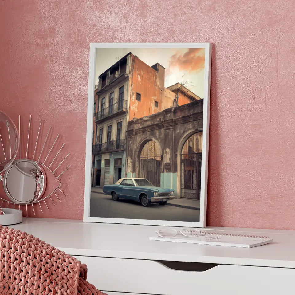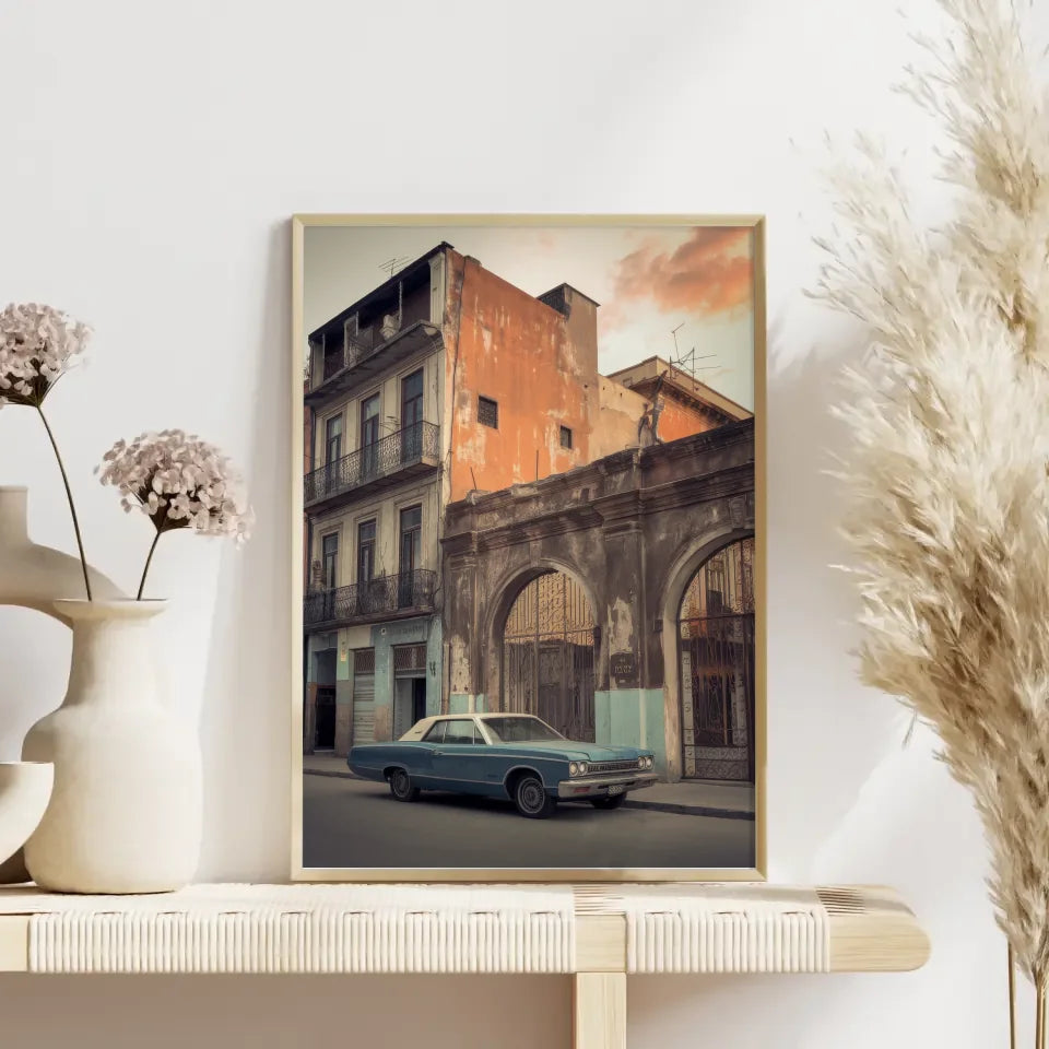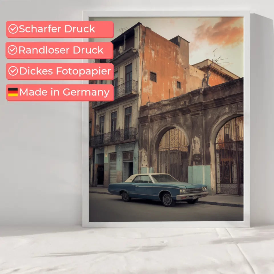 Entdecken Sie unser einzigartiges Vintage Poster mit Stadtstraße und klassischem Auto, das einen Hauch von Nostalgie in Ihr Zuhause bringt. Dieses exquisite Wandbild zeigt ein beeindruckendes Foto, das eine charmante Stadtstraße in Kuba einfängt. Im Vordergrund parkt ein klassisches blauer Auto in der Nähe eines alten, verwitterten Torbogens, während im Hintergrund mehrstöckige Gebäude mit verzierten Balkonen und verblassten Fassaden erstrahlen.