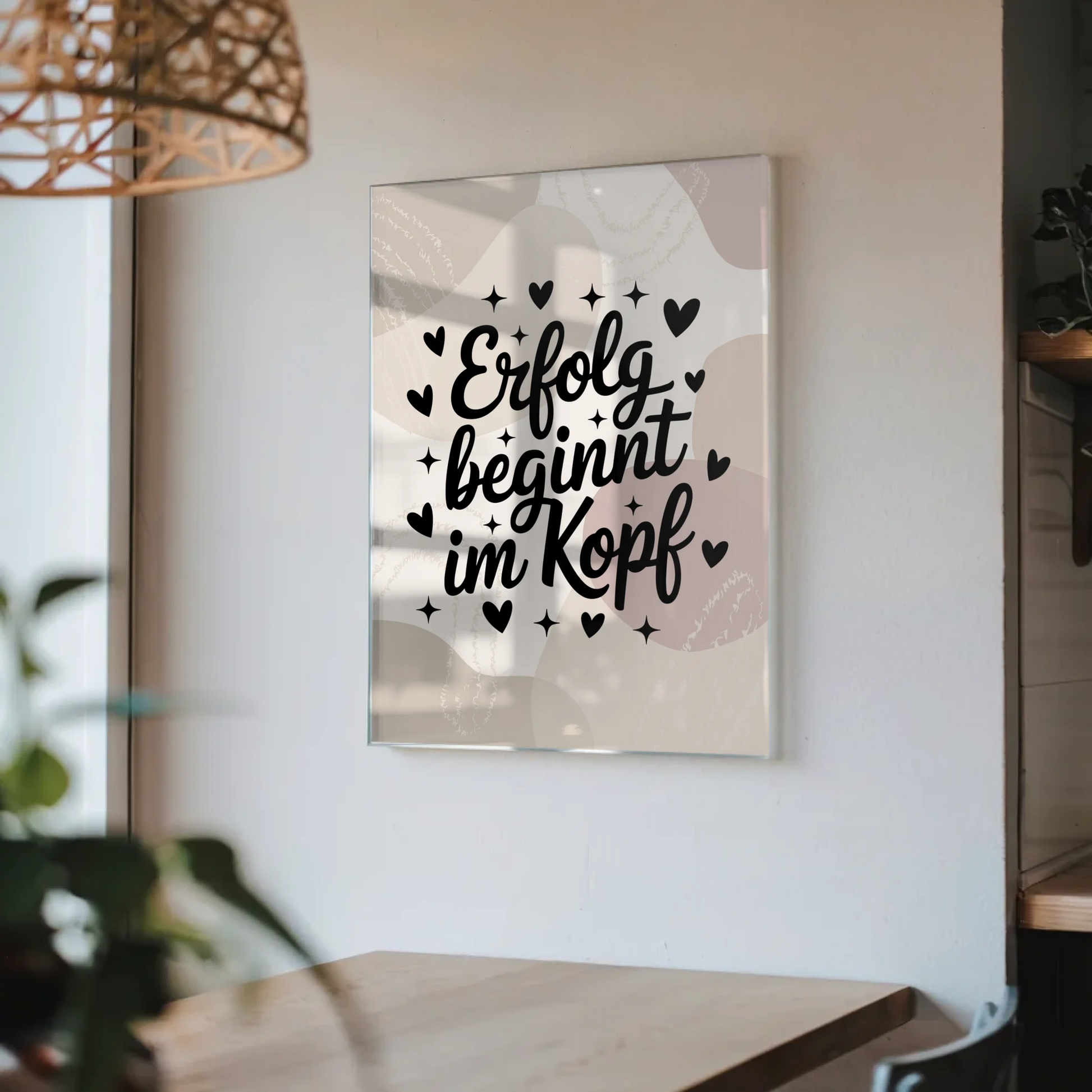 Egal ob als inspirierendes Element in deinem BĂŒro oder als persönliches Highlight in deinem Wohnzimmer â dieses Wandbild ist eine wunderbare Geschenkidee, die immer gut ankommt. Lass dich von der Botschaft 'Erfolg beginnt im Kopf' tĂ€glich motivieren und erinnere dich daran, dass positive Gedanken der SchlĂŒssel zum Erfolg sind.