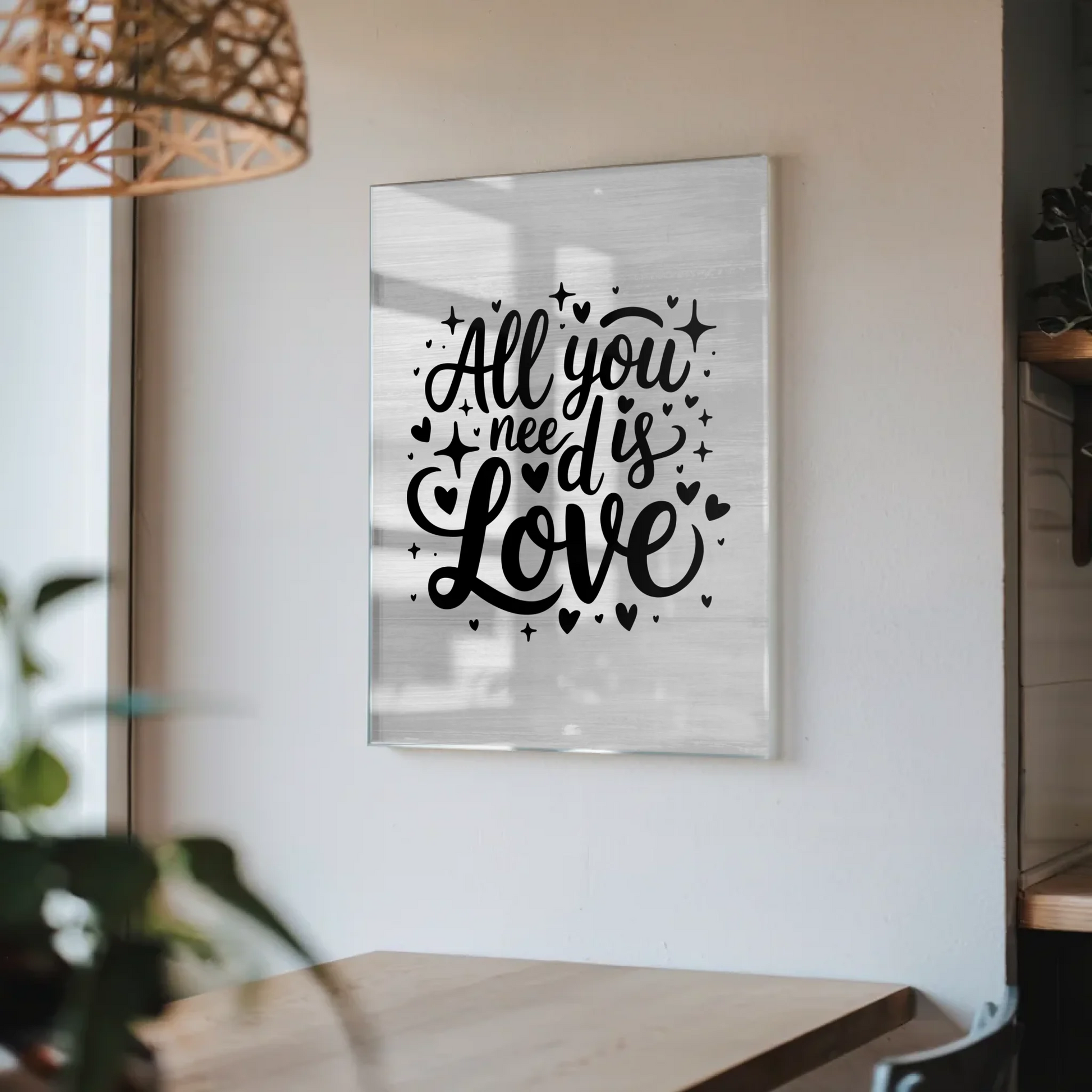 Entdecke das perfekte Wandbild Auf Acrylglas, das mit dem inspirierenden Spruch All you need is love dein Zuhause verschönert. Dieses personalisierbare Geschenk ist ideal fĂŒr jeden Anlass und bringt eine positive AtmosphĂ€re in jeden Raum.