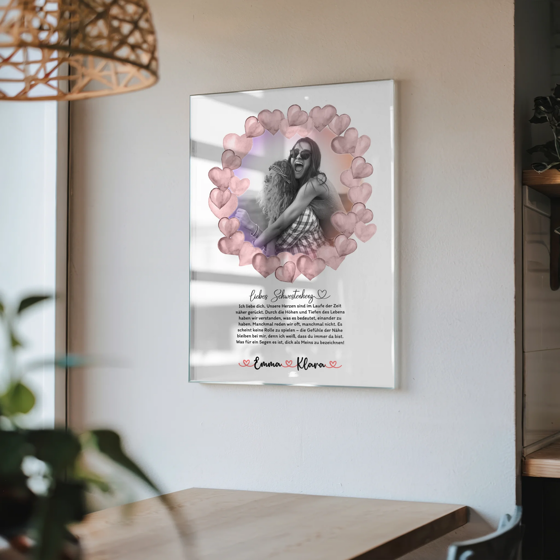 Material und Verarbeitung: Hochwertiges Acrylglas für tiefe Kontraste und intensive Farben, präziser Fotodruck für feine Details und langlebige Oberfläche. Das Wandbild eignet sich besonders als Geschenk zur Geburtstag und zeigt mit dem Spruch Schwester Ich Liebe Dich genau die richtige Botschaft. Gestalte dein persönliches Wandbild mit Foto, Namen und Wunschtext und schaffe ein emotionales Erinnerungsstück, das lange Freude macht.