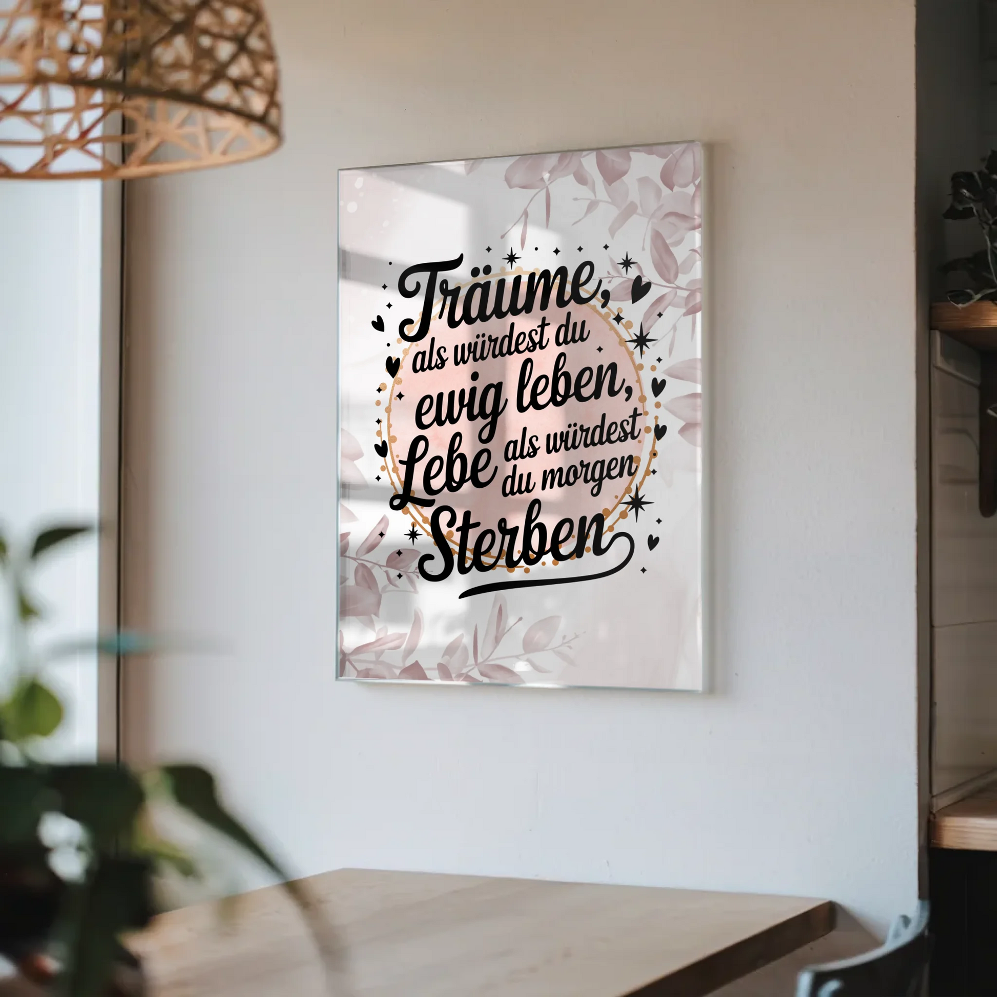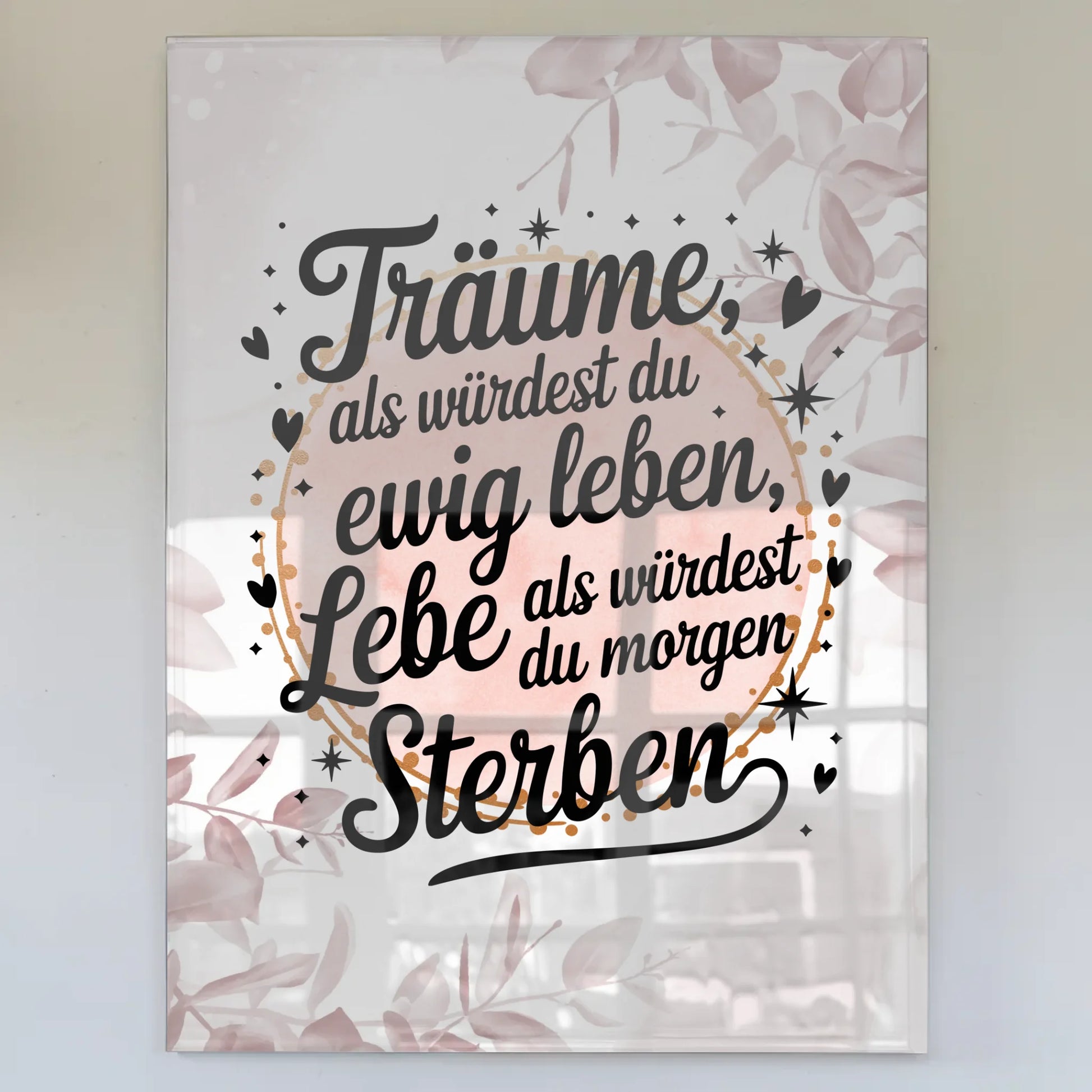 Entdecke das perfekte Geschenk für jeden Anlass mit unserem Wandbild Auf Acrylglas Träume Lebe Zitat Geschenk. Dieses einzigartige Wandbild inspiriert mit dem motivierenden Spruch: 'Träume, als würdest du ewig leben. Lebe, als würdest du morgen sterben'. Es ist nicht nur ein schöner Spruch, sondern auch eine tägliche Affirmation, die dich daran erinnert, das Beste aus jedem Tag zu machen.