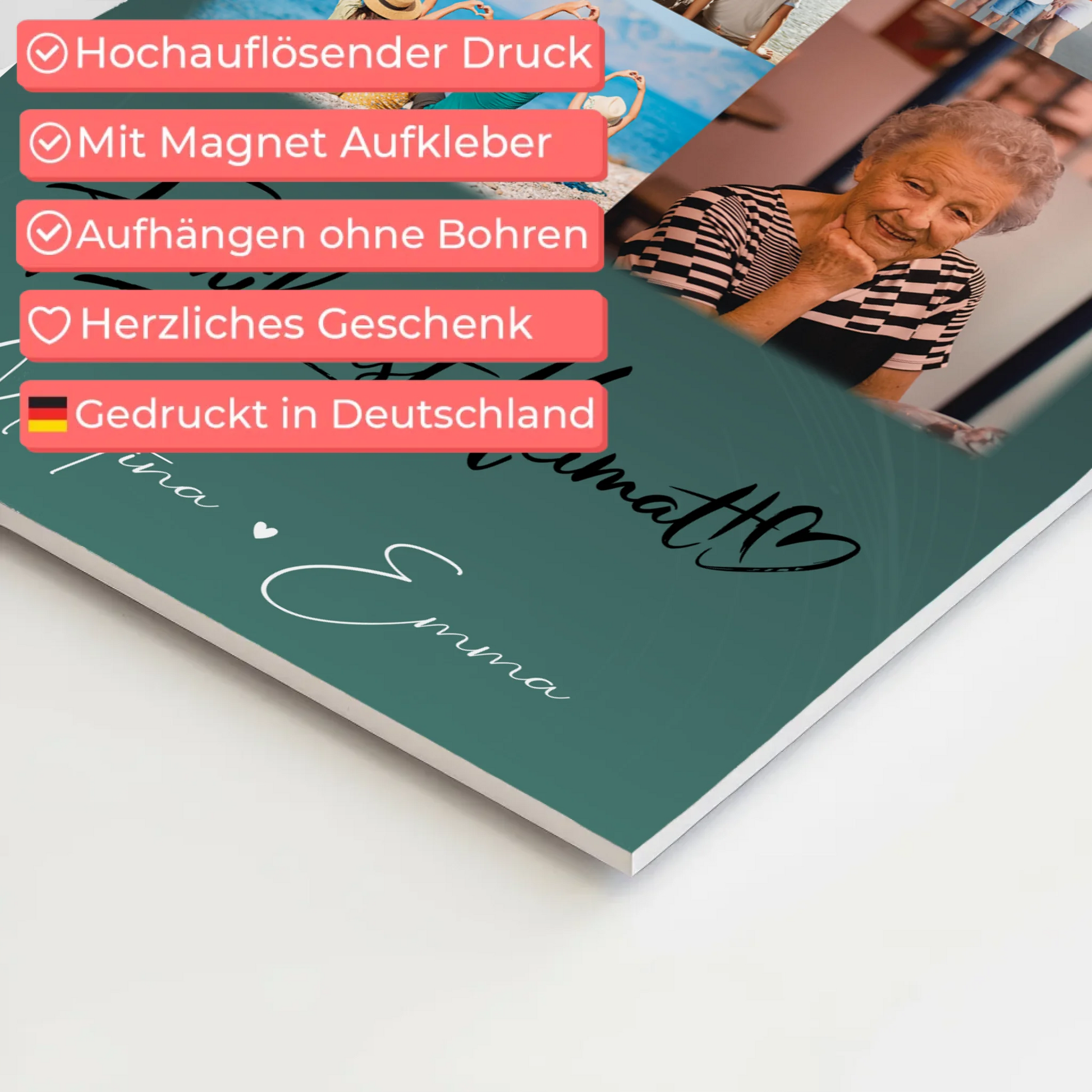 Entdecke unser einzigartiges Produkt: das Wandbild Familie Personalisiert mit 9 Fotos Familie ist Heimat Geschenk. Dieses individuell gestaltbare Kunstwerk vereint deine schönsten Familienmomente auf einer Leinwand und macht dein Zuhause noch persönlicher. Du kannst das Wandbild ganz nach deinen Wünschen anpassen: Füge 9 deiner Lieblingsfotos hinzu, ergänze einen eigenen Spruch oder Wunschtext sowie die Namen deiner Familienmitglieder. Das Design ist geprägt vom inspirierenden Spruch „Familie ist Heimat“, der die Verbundenheit und Liebe in deiner Familie perfekt widerspiegelt. Dieses Geschenk eignet sich für jeden Anlass – sei es Geburtstag, Weihnachten, Jubiläum oder einfach, um deine Familie zu überraschen. Es ist ideal für alle Familienmitglieder, die ihre gemeinsame Zeit und Liebe auf eine besondere Weise festhalten möchten. Mach dein Zuhause einzigartig und zeige deinen Liebsten, wie viel sie dir bedeuten, mit diesem personalisierten Wandbild, das garantiert für Freude sorgt.