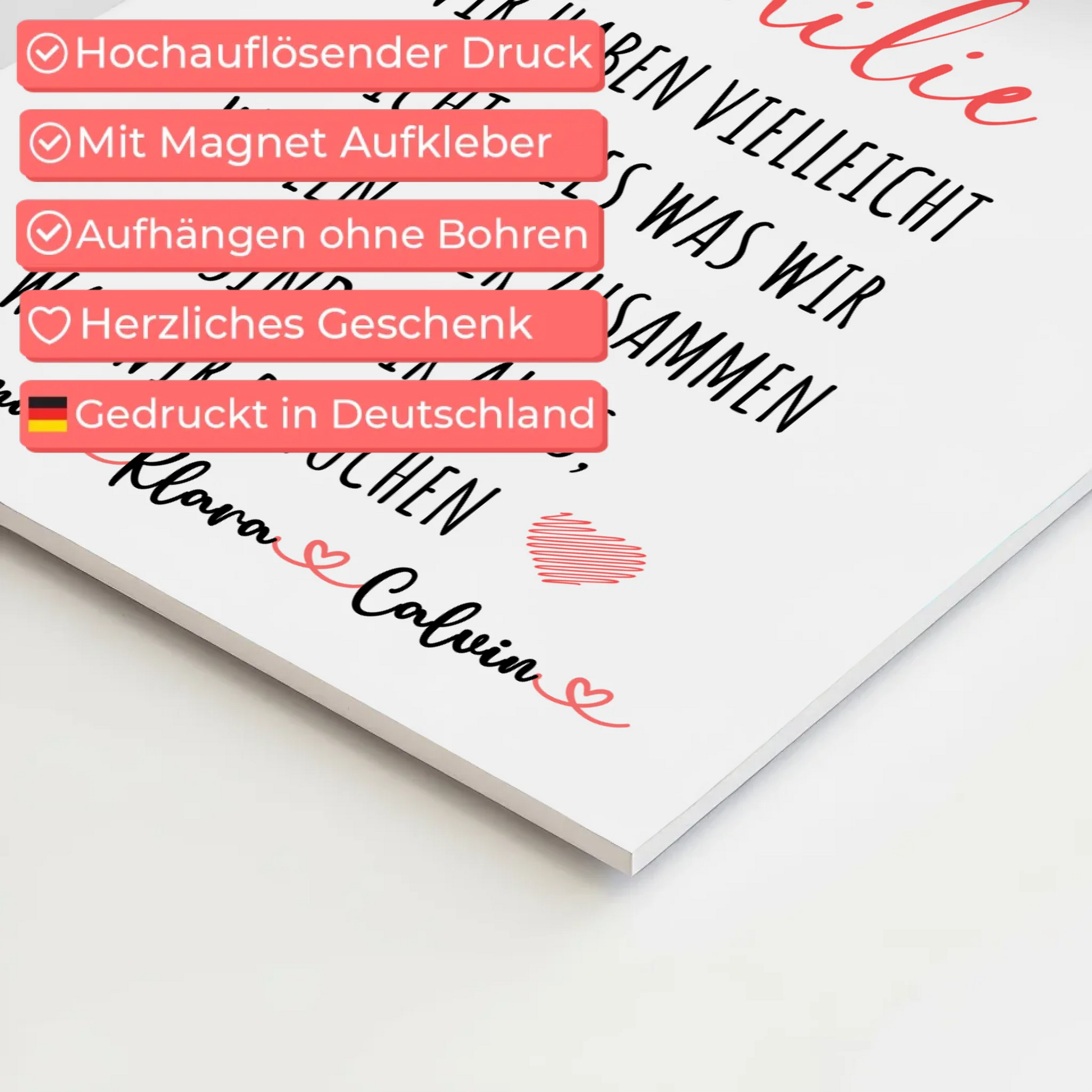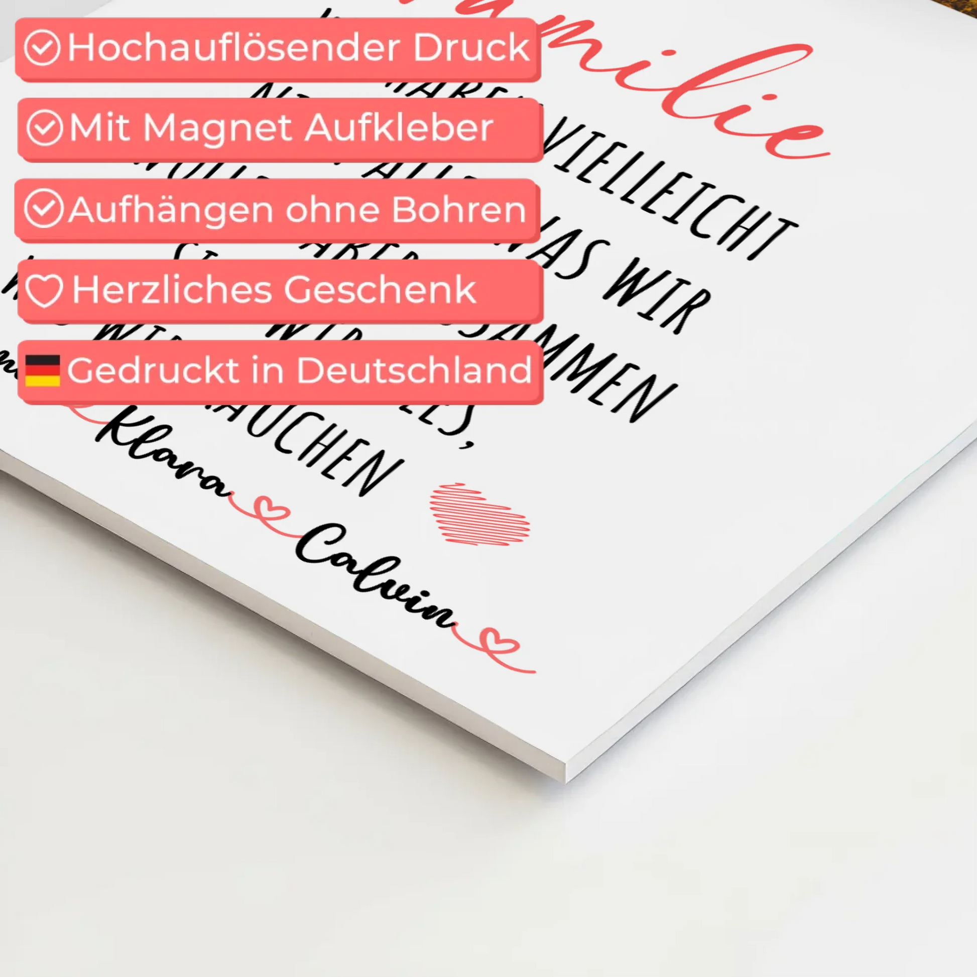 Das Wandbild besticht durch eine wunderschöne Fotocollage mit 3 Fotos und dem inspirierenden Spruch „Wir Sind Alles. Zusätzlich ziert das Design der bewegende Satz: „Familie - Wir haben vielleicht nicht alles was wir wollen aber zusammen sind wir alles was wir brauchen. Diese liebevollen Worte machen das Wandbild zu einem ganz besonderen Geschenk für Familienmitglieder.