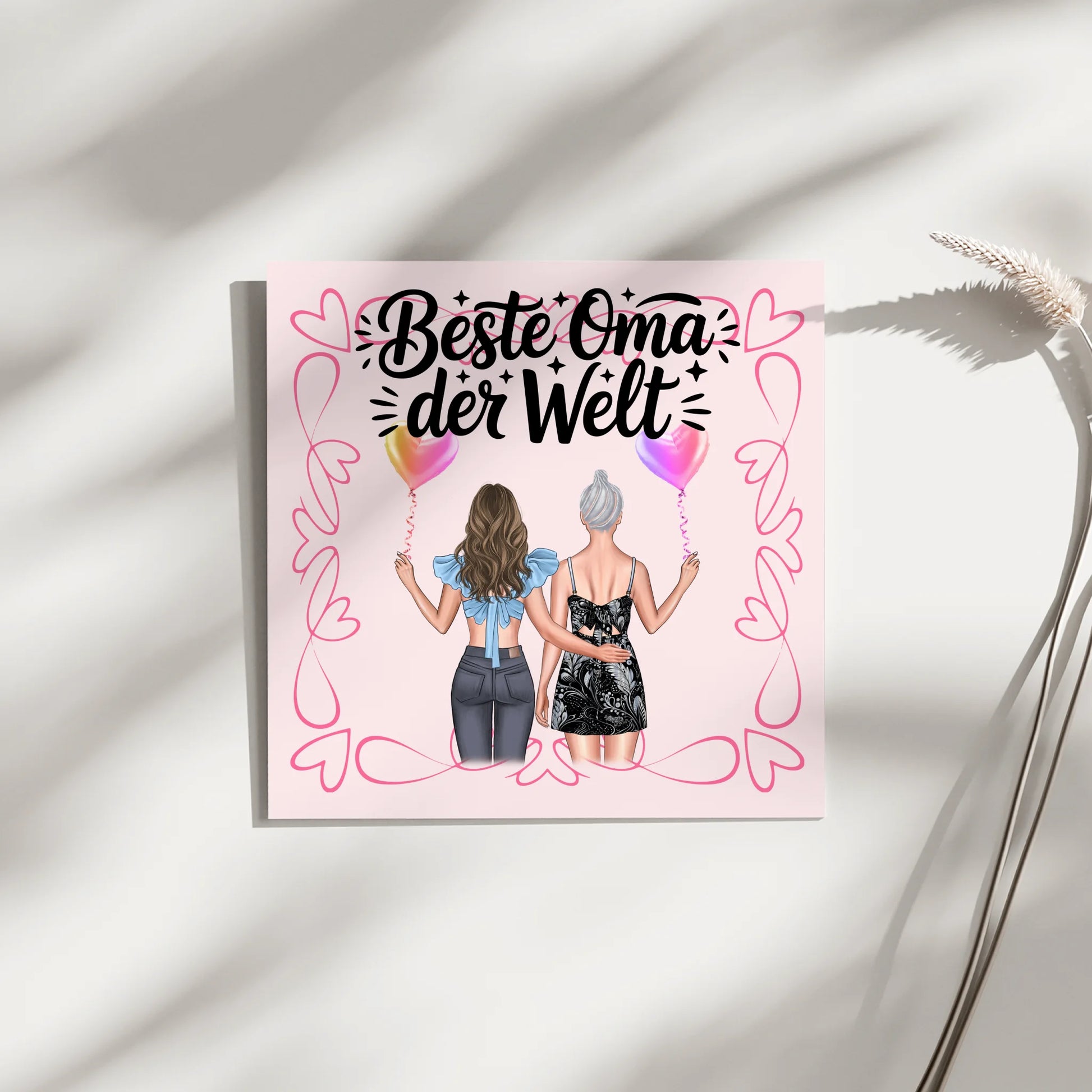 Stell dir vor, du schenkst deiner Oma etwas, das sie jeden Tag an eure besondere Verbindung erinnert: eine hochwertige Leinwand mit dem liebevollen Spruch Beste Oma Der Welt und zwei liebevoll gestalteten Clipart Frauen, die vielleicht dich und deine Geschwister zeigen.