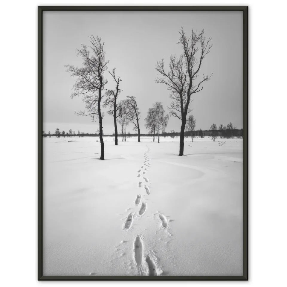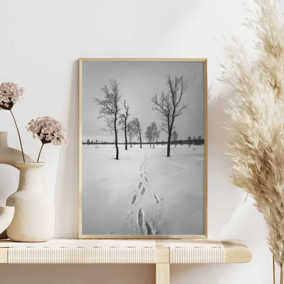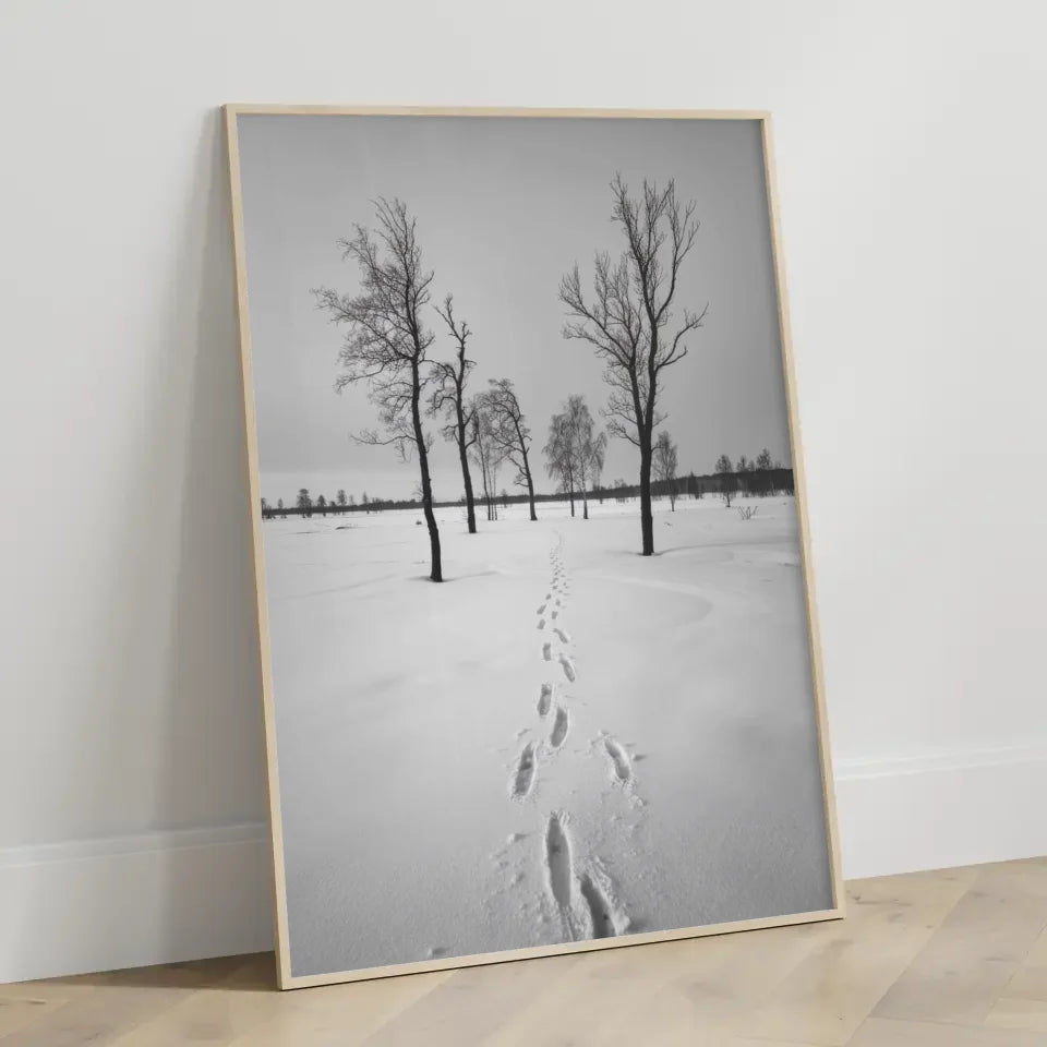 Winterlandschaft Poster mit kahlen BĂ€umen und FuĂabdruck im Schnee