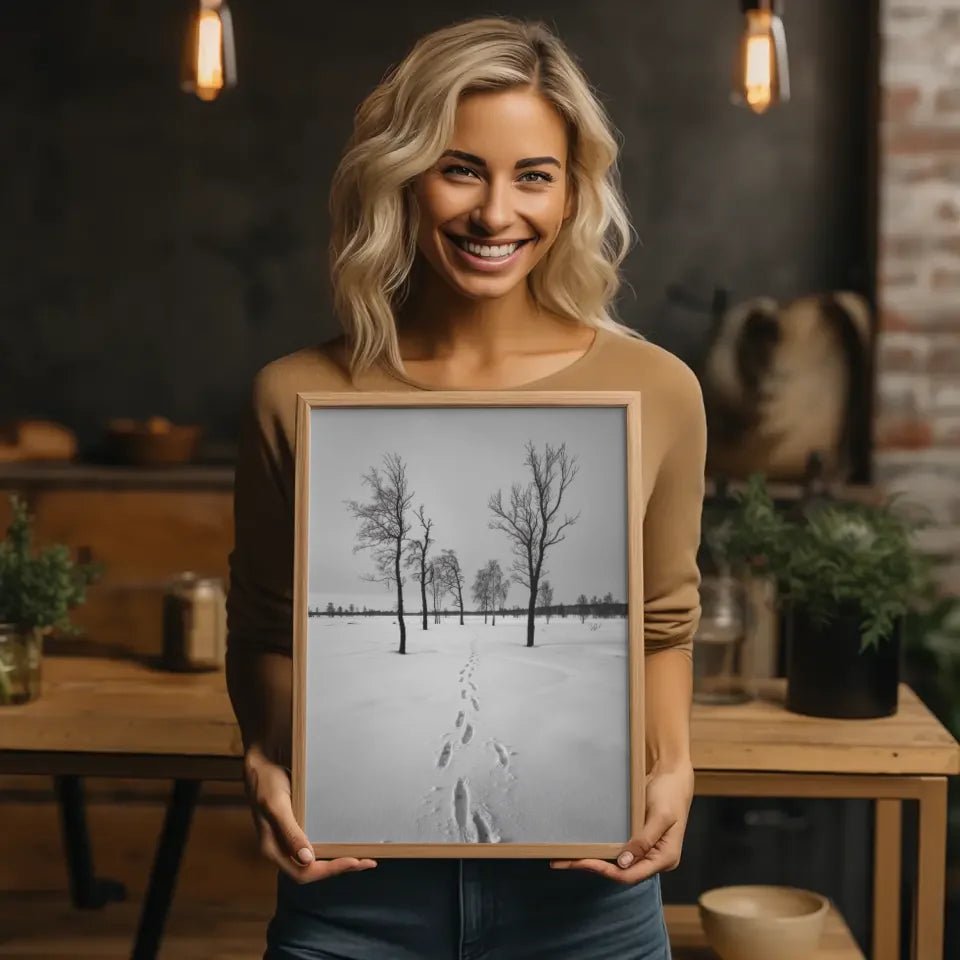 Entdecken Sie unser einzigartiges Winterlandschaft Poster mit kahlen BĂ€umen und FuĂabdruck im Schnee, das eine atemberaubende Winterstimmung in Ihr Zuhause bringt. Dieses Poster zeigt eine eindrucksvolle, trostlose Landschaft, die bis zum Horizont reicht. Die kahlen BĂ€ume, die wie WĂ€chter vor einem grauen Himmel stehen, verleihen dem Bild eine mystische AtmosphĂ€re. Jeder Zentimeter des Posters ist sorgfĂ€ltig gestaltet, um die Textur des Schnees mit subtilen Variationen in WeiĂ und Hellgrau zu unterstreichen.