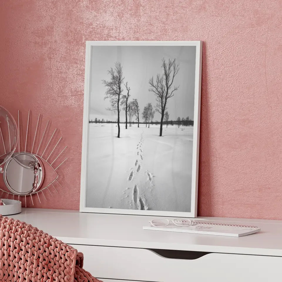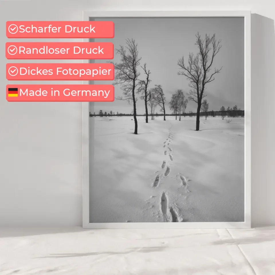 Ein einzelner FuĂabdruck zieht durch die unberĂŒhrte Schneedecke und fĂŒhrt den Betrachter in diese stille, faszinierende Welt. Dieses Poster eignet sich nicht nur perfekt als winterliche Wanddekoration, sondern setzt auch ein kraftvolles Statement in jedem Raum. Lassen Sie sich von der kalten Schönheit dieser Winterlandschaft inspirieren und genieĂen Sie die Ruhe, die dieses Kunstwerk ausstrahlt.