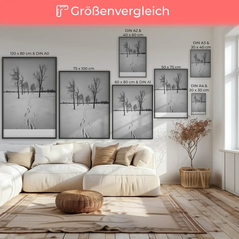 Unser Winterlandschaft Poster ist in verschiedenen GröĂen erhĂ€ltlich und kann sowohl als hochwertiges Poster als auch als edle Leinwand bestellt werden. Gestalten Sie Ihr Zuhause mit dieser einzigartigen Winterdekoration, die sowohl zeitlos als auch modern ist. Verleihen Sie Ihren WĂ€nden einen Hauch von Winter mit unserem beeindruckenden Winterlandschaft Poster â die ideale Wahl fĂŒr alle, die die stille Schönheit der kalten Jahreszeit lieben.