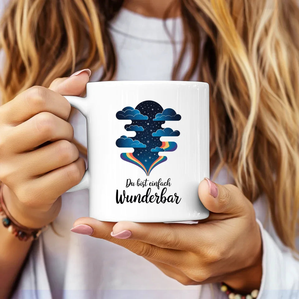 Die wunderbare Tasse trägt den inspirierenden Spruch 'Du bist einfach wunderbar' in handgefertigter Schreibschrift, der nicht nur zum Träumen anregt, sondern auch Freunde und Familie erfreuen wird. Egal ob beim Frühstück, als Geschenk oder einfach nur zur eigenen Freude – diese Tasse ist ein echter Blickfang.